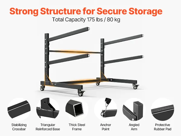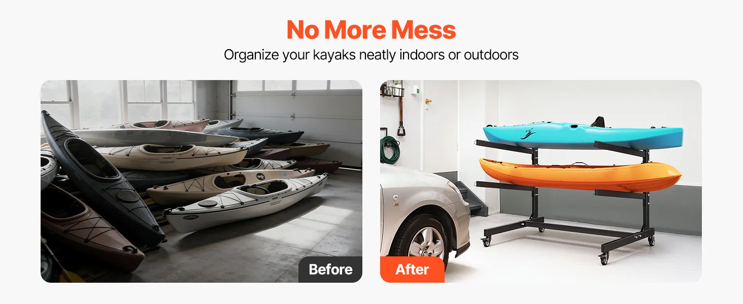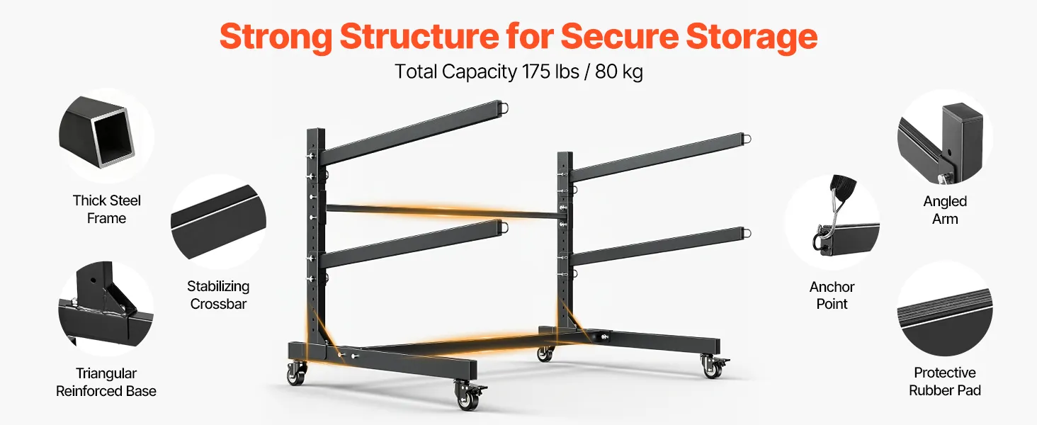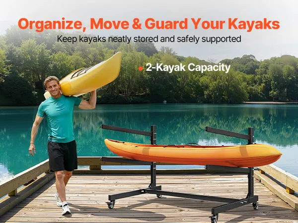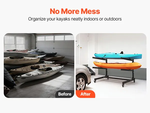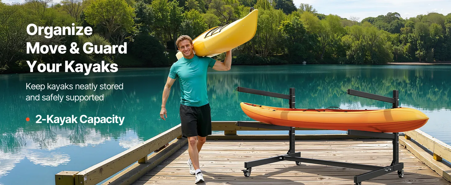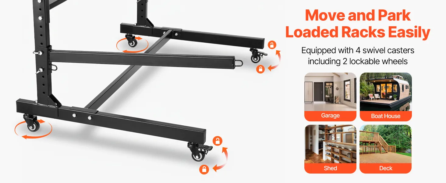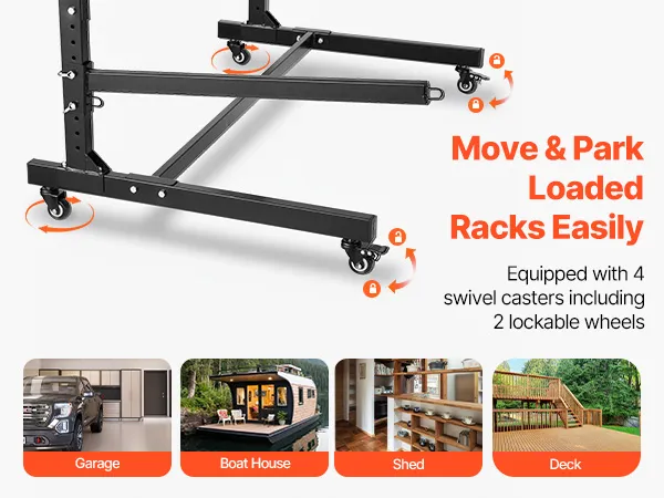 Locking Casters: Easily move your kayak stand rack using the four swivel casters, including two lockable wheels. You can shift the entire setup from your garage to the beach or simply reorganize your space without heavy lifting