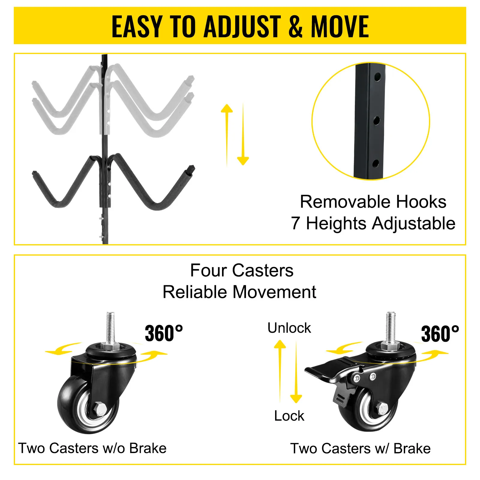 Removable hooks can be adjusted to meet your different sized kayaks. Two casters with brake and two casters without brake provide reliable movement for you.
