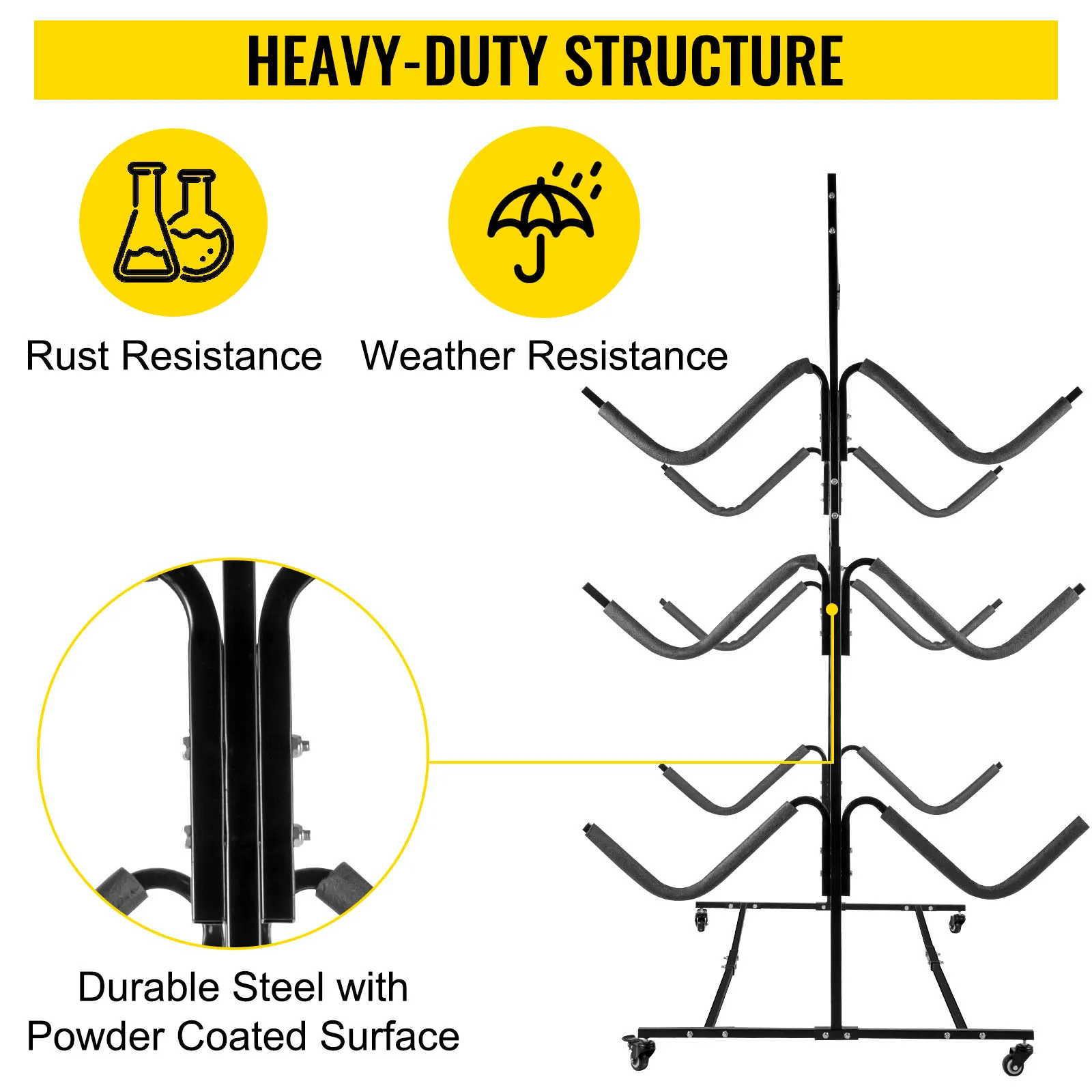Our outdoor kayak storage rack has 6 boat capacity, which can hold up to 600LB. Thickened steel tube with powder coating make it solid and stable. 360° casters make your movement smooth. It is pretty easy to assemble and can be used indoors or outdoors, and anywhere you desire to use it.