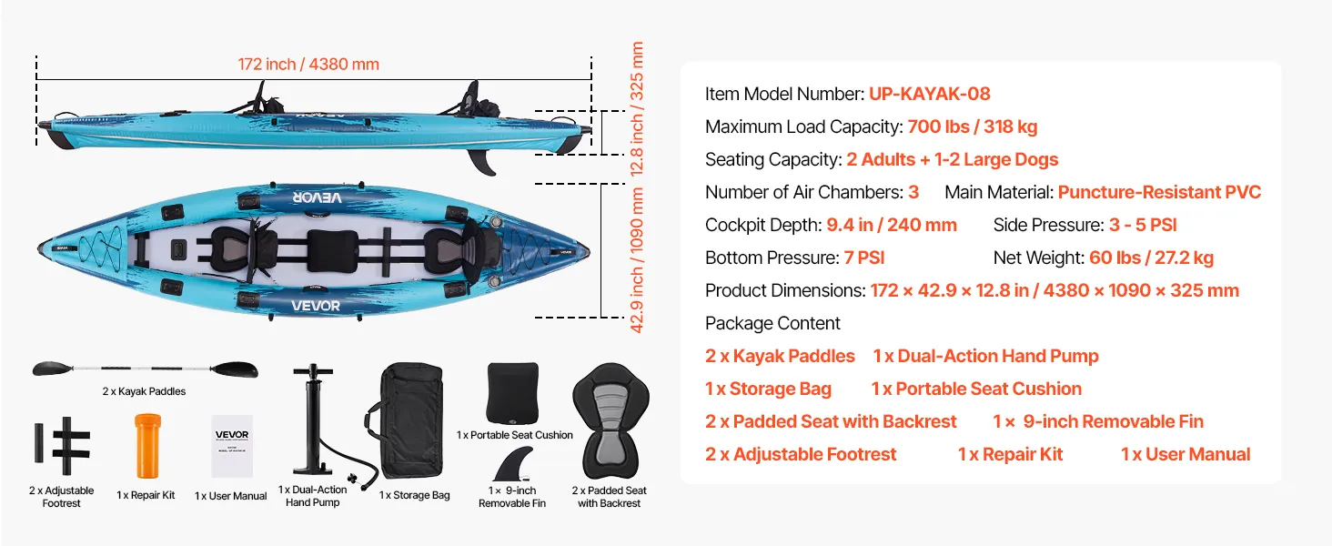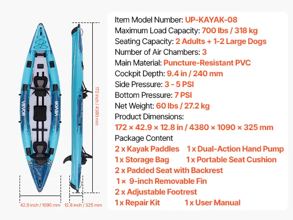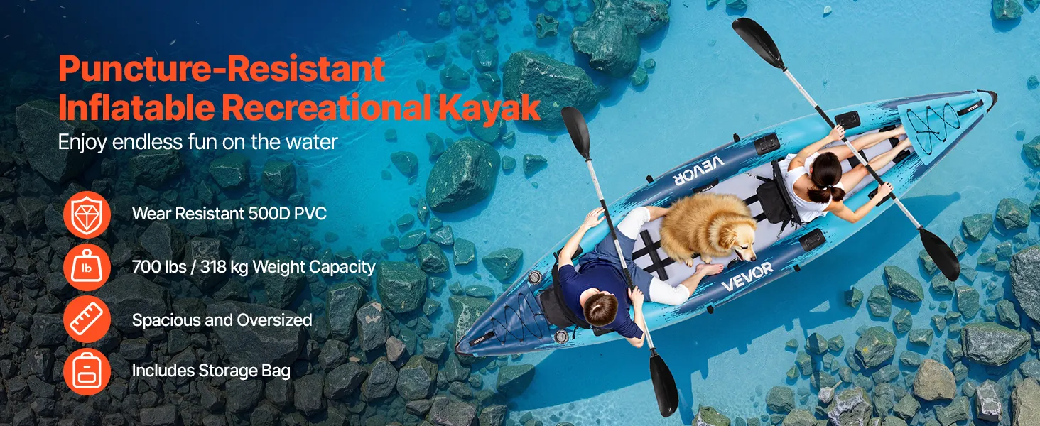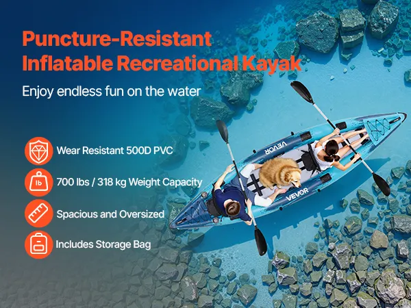 This inflatable kayak combines strong load capacity, flexible control, rigid structure, comfortable seating, and easy inflation. Resistant to wear and punctures, it supports up to 700lbs (318kg), easily holding 2 adults and 1–2 large dogs, delivering a smooth and enjoyable paddling experience.
