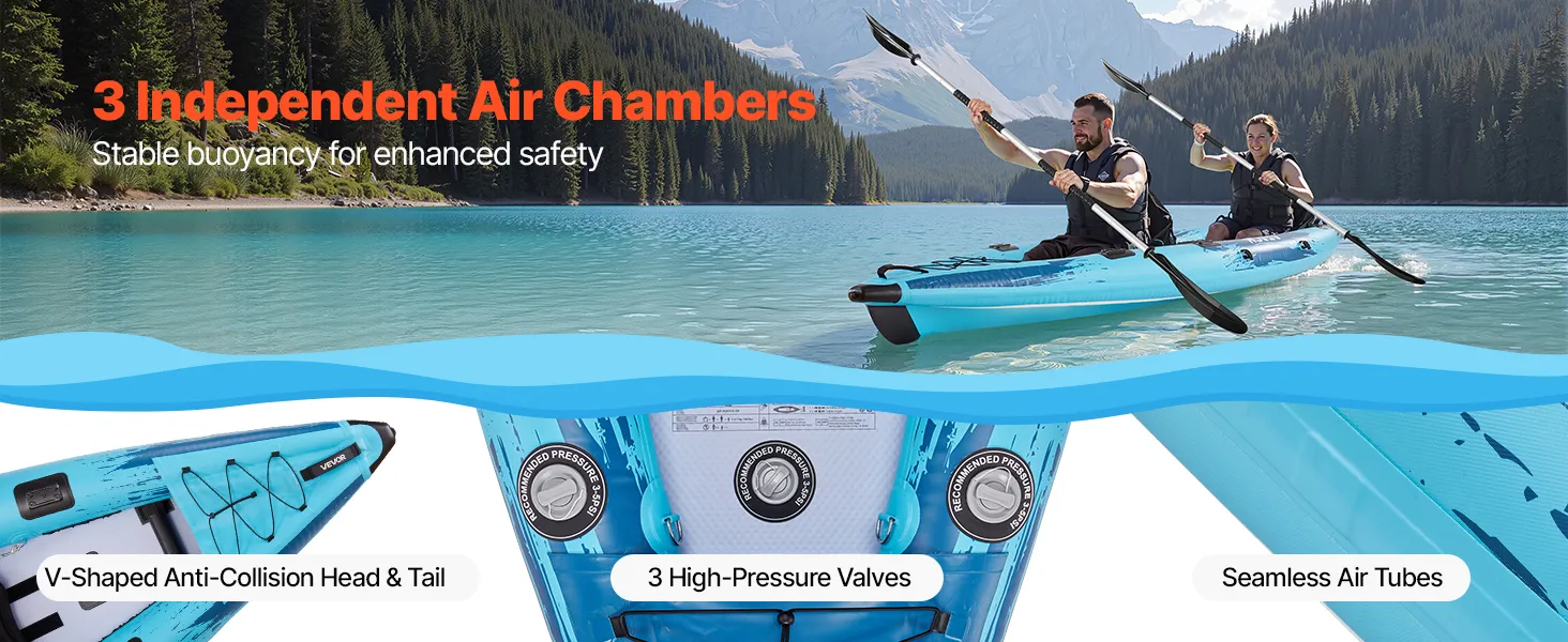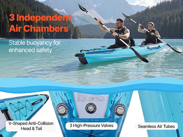 Equipped with 3 independent air chambers, this inflatable recreational kayak offers stable buoyancy and enhanced safety. Seamless air tubes combined with anti-collision head and tail further improve air tightness and impact resistance.
