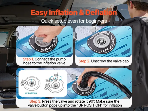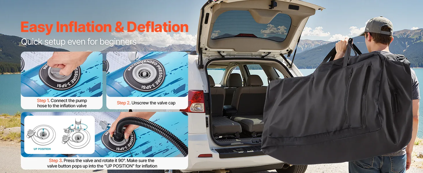 Inflatable & Portable: Comes with 3 high-pressure valves and a dual-action hand pump for quick inflation, easy deflation and storage after use. The included storage bag makes packing and carrying easy, and the handy repair kit helps you quickly fix unexpected scratches or small leaks