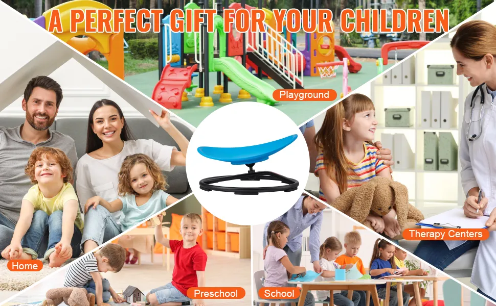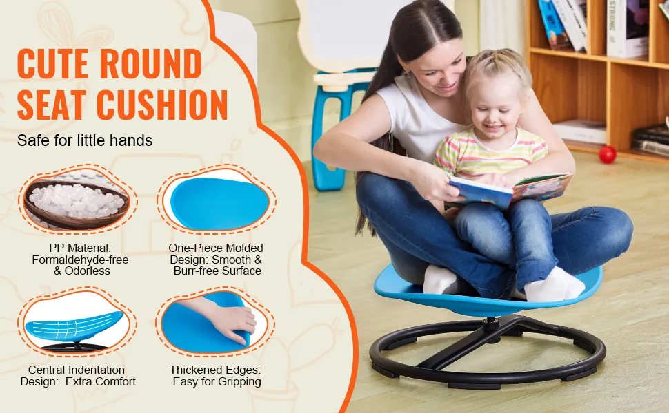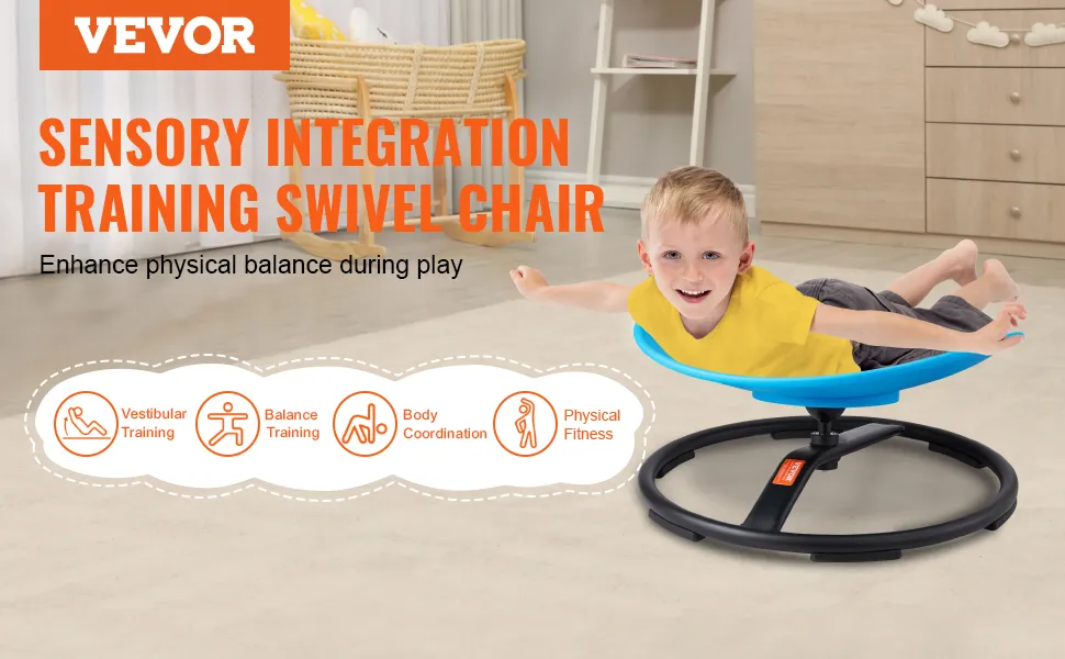 This 360° swivel chair engages children's vestibular systems, enhancing coordination and balance. It features a sturdy 20.5-in metal base, supports up to 220 lbs, and has a padded seat for comfort. The anti-slip design and smooth edges ensure security. Easy to assemble, it's ideal for home.