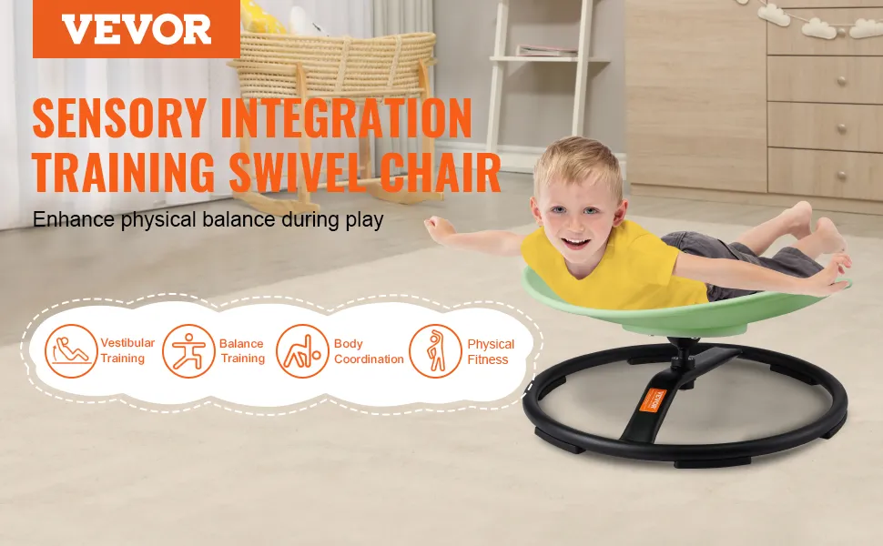 This 360° swivel chair engages children's vestibular systems, enhancing coordination and balance. It features a sturdy 20.5-in metal base, supports up to 220 lbs, and has a padded seat for comfort. The anti-slip design and smooth edges ensure security. Easy to assemble, it's ideal for home.
