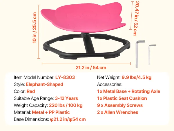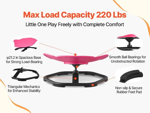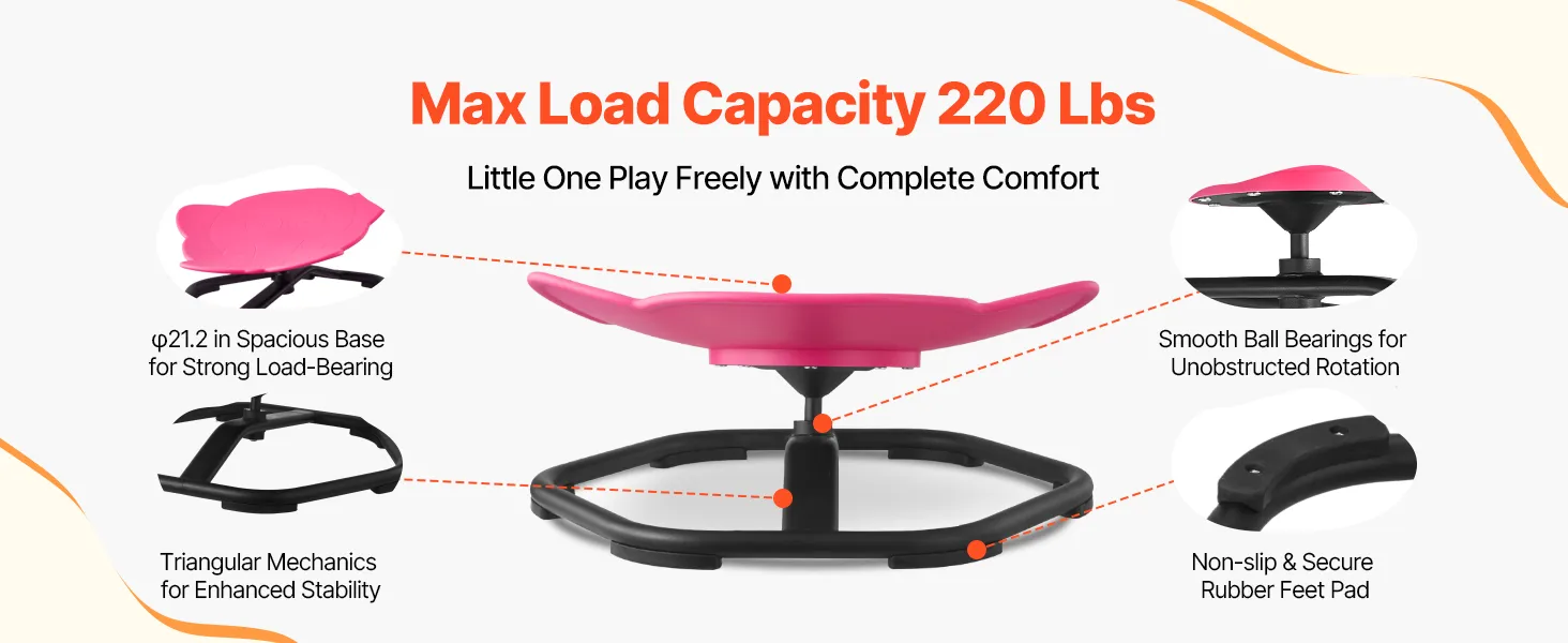 The kids spinning chair with widened 21.2 in/54 cm metal base supports up to 220 lbs/100 kg. Its triangular structure with ball bearings ensures smooth spinning, and the anti-slip design prevents sliding during play.