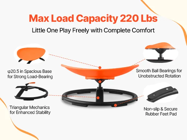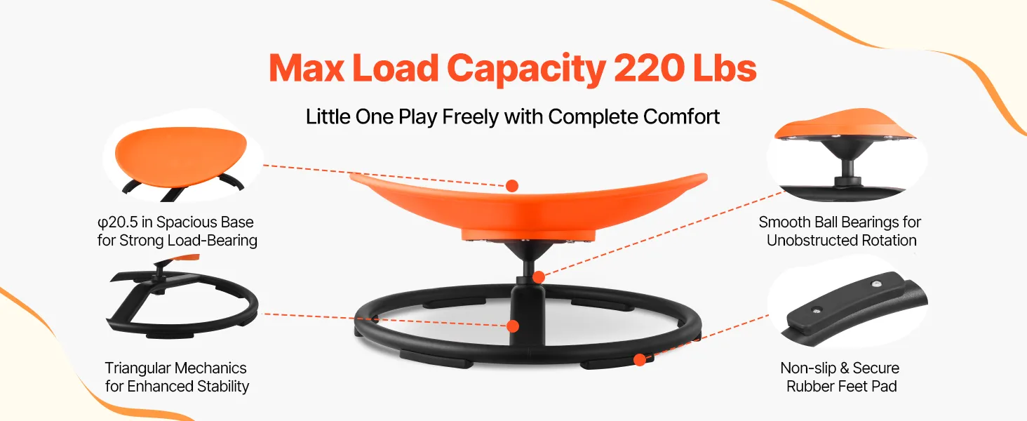 The kids spinning chair with widened 20.8 in / 53 cm metal base supports up to 220 lbs / 100 kg. Its triangular structure with ball bearings ensures smooth spinning, and the anti-slip design prevents sliding during play.