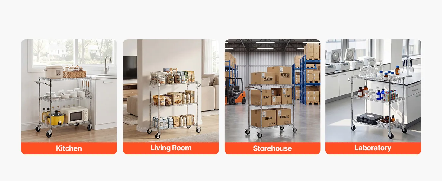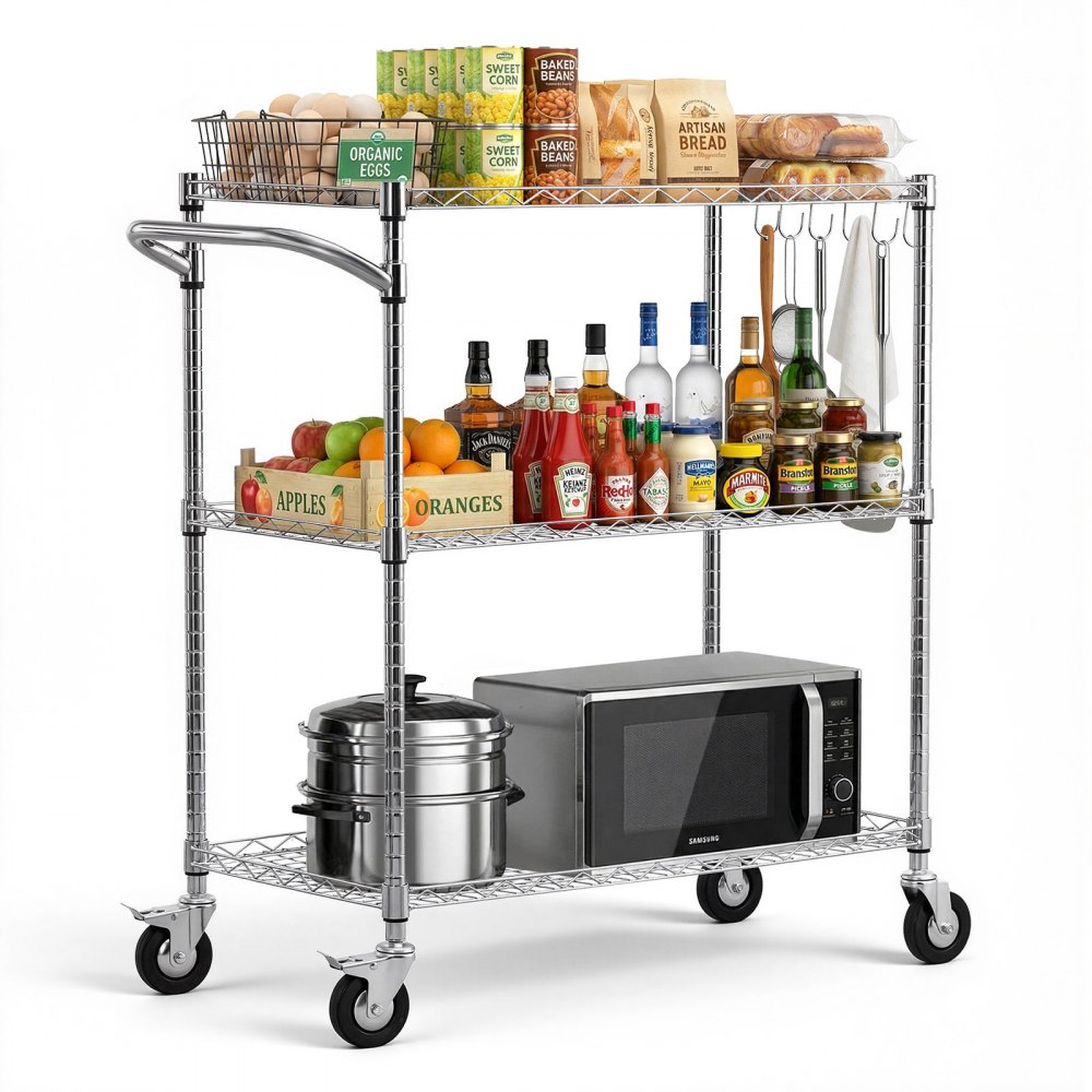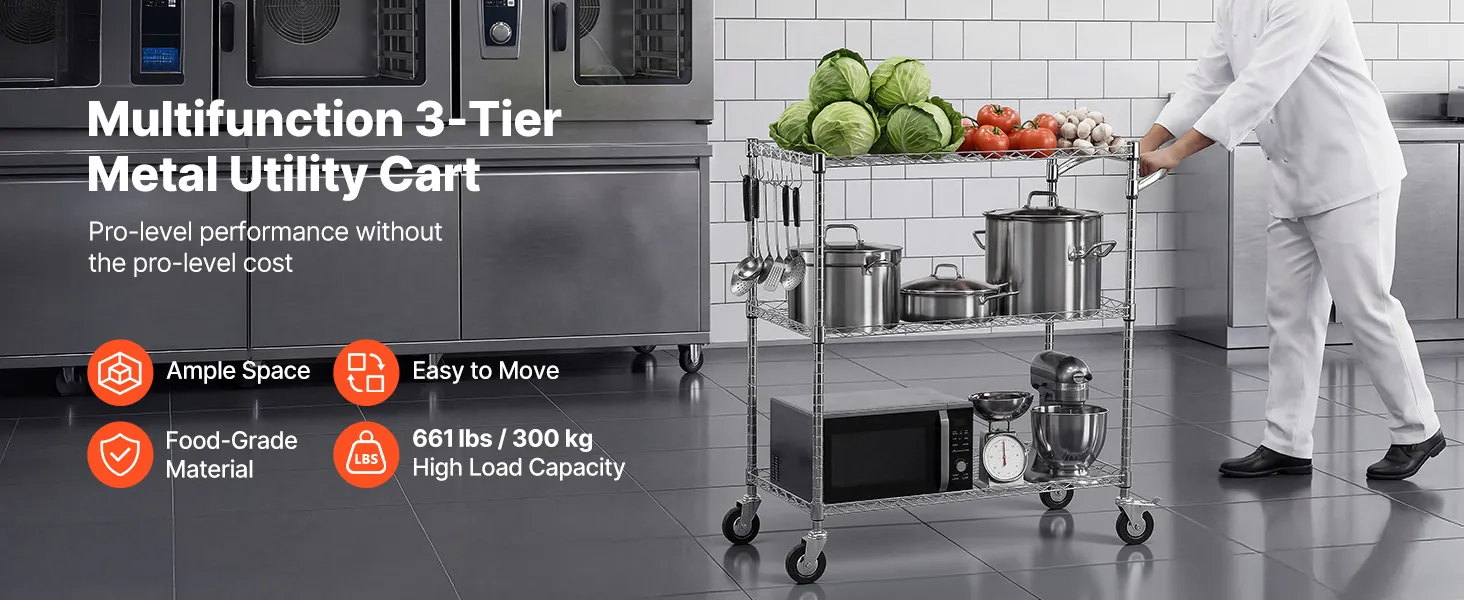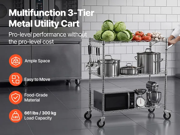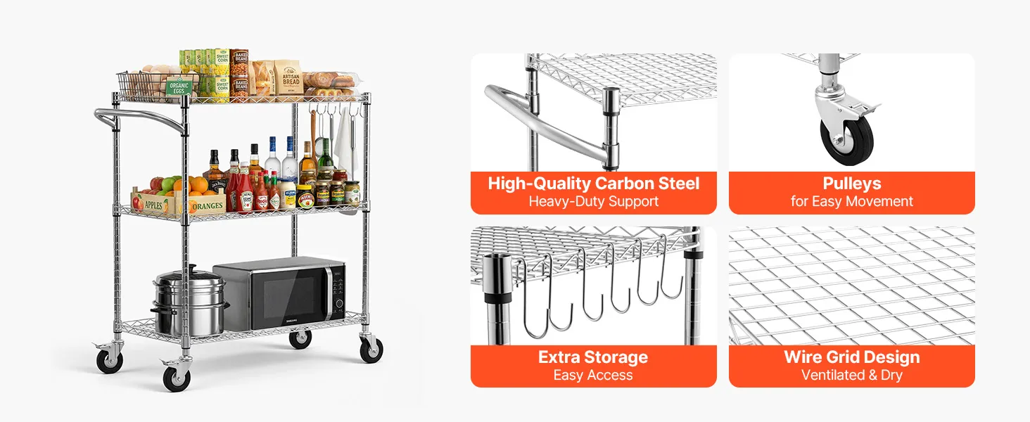 Sturdy Frame: This kitchen utility cart supports 661 lbs / 300 kg static load. Built with Q195 carbon steel and a chrome-plated frame, this rolling cart resists rust and warping in humid environments