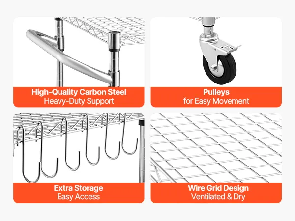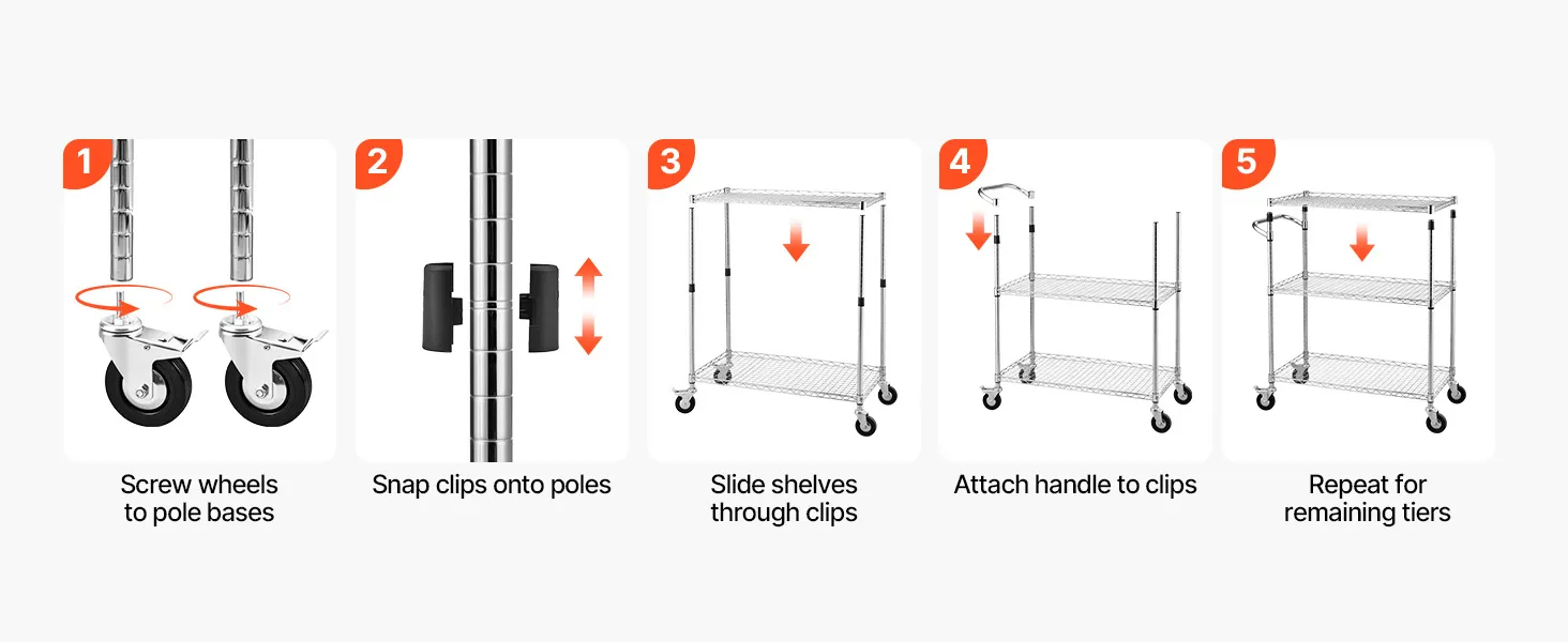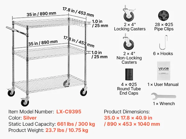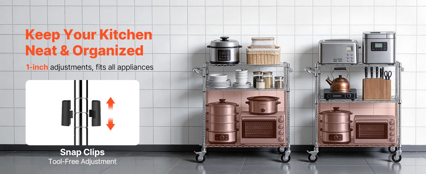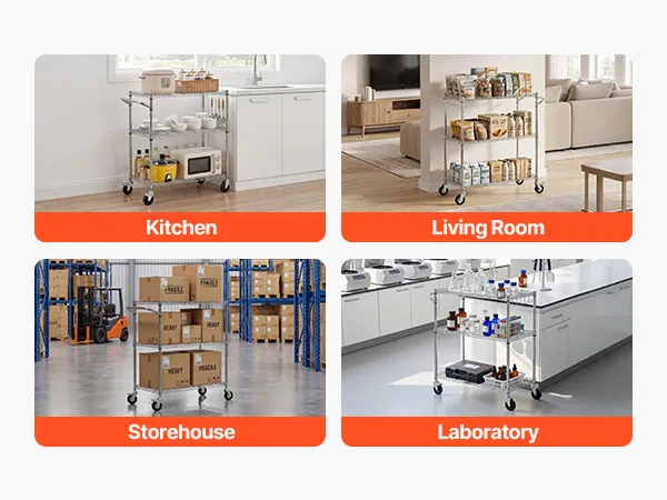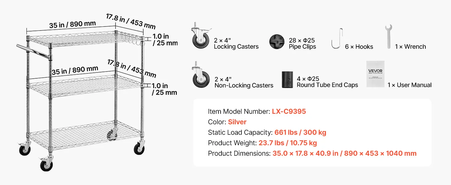 Sturdy Frame: This kitchen utility cart supports 661 lbs / 300 kg static load. Built with Q195 carbon steel and a chrome-plated frame, this rolling cart resists rust and warping in humid environments