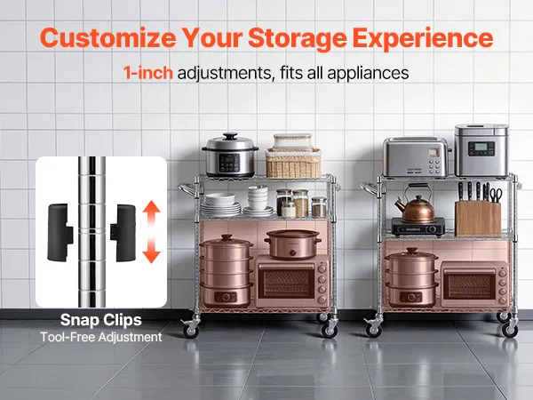 Snap-in design with precise 1-inch height adjustments on each level allows you to customize the shelf height as needed to fit items of different sizes.