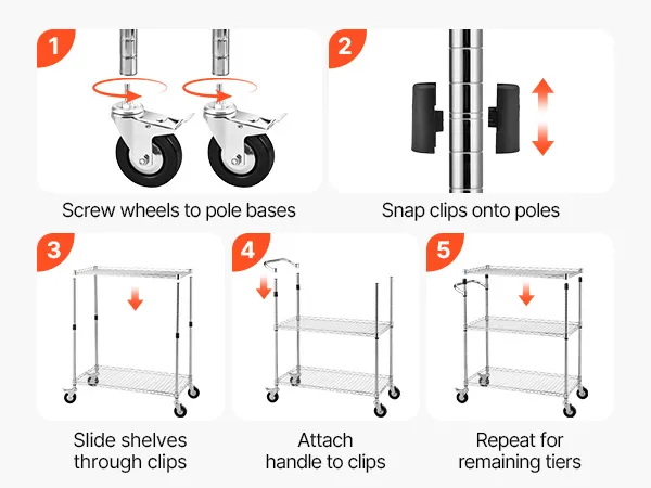 Adjustable Height: This service cart features a snap-in design for 1-inch shelf height adjustments. Detachable armrests let you customize assembly and height for this storage trolley as needed