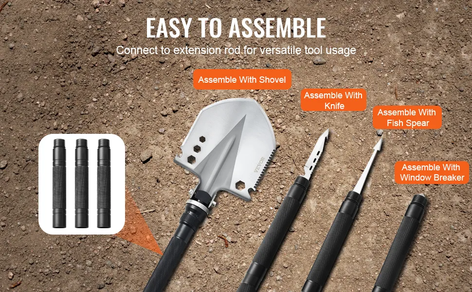You can assemble the portable survival shovel with the extension rods to maximize functionality and adapt each tool for more applications!