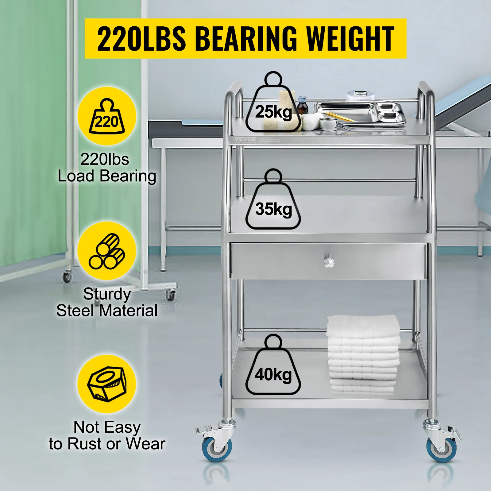 It is very versatile. You can use it in homes, offices, and medical facilities. This means you can carry food, medical supplies, or tools easily. The cart has a three-tier design and large wheels that make it easy to move around. Our cart holds up to 220 lbs. So, this machine is perfect for anyone who needs a dependable and versatile cart. If you need a cart that can easily handle various tasks, then choose the VEVOR lab serving cart.