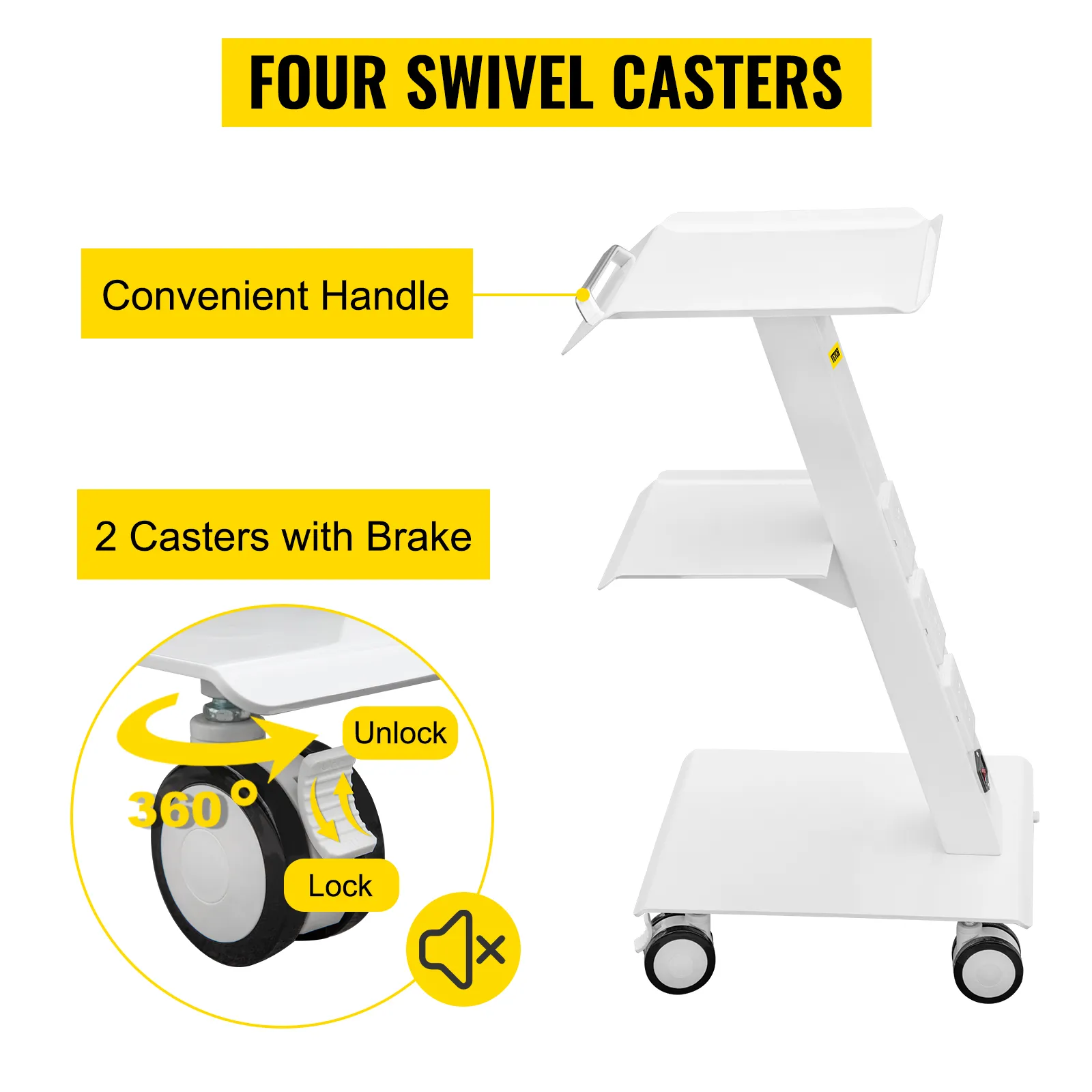Four 360° rolling wheels provide easy mobility for transporting heavy equipment. A handle is designed on the side of this clinic cart. Plus, two foot-operated lockable casters are also included for stability.
