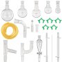This glassware kit can be used to assemble various distillation apparatuses, fractional distillation apparatuses, and reflux apparatuses.