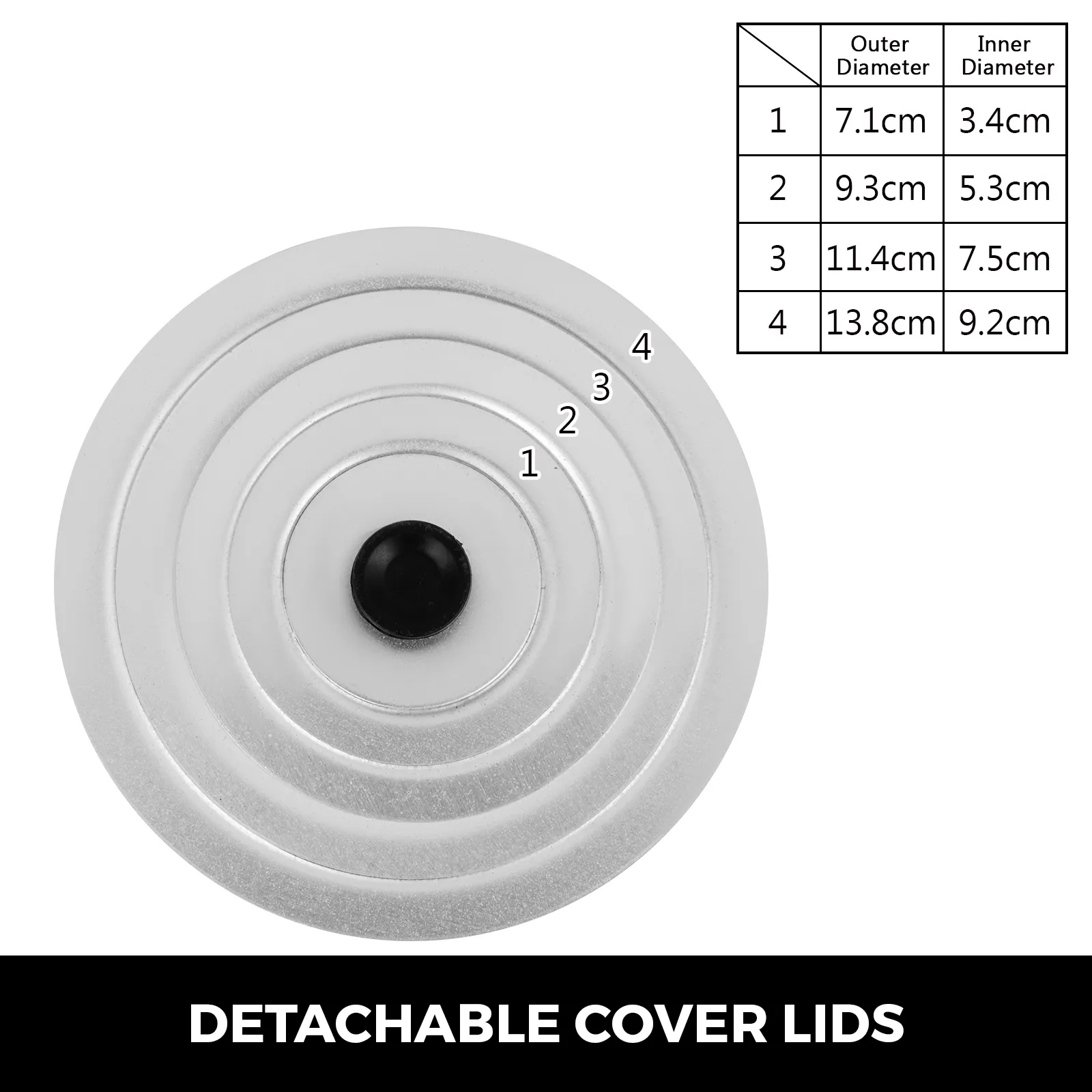 Steel lids are detachable to suit flasks in different size & type. It is made up of 4 pieces, each inner & outer diameter is: 3.4/7.1cm; 5.3/9.3cm; 7.5/11.4cm; 9.2/13.8cm.