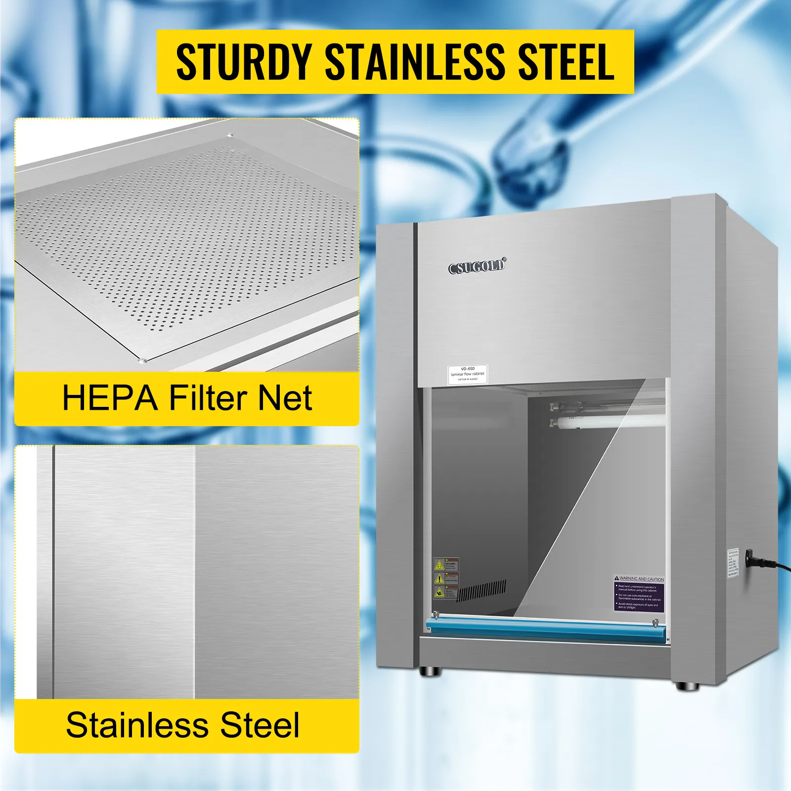 The laminar flow hood is incredibly durable with super-hard and rustproof stainless steel. HEPA filter net is capable of high-efficiency filtration.