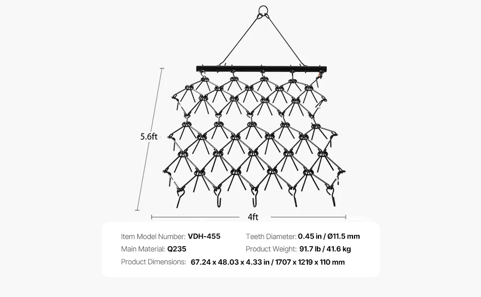 VEVOR Drag Harrow, 4 ft x 5.6 ft Durable Chain Harrow with 80 Sharp Teeth, Suitable for ATV UTV Tractor, Ideal for Soil Preparation, Seeding, Smoothing Landscapes, and Yard Gravel Driveway Maintenance