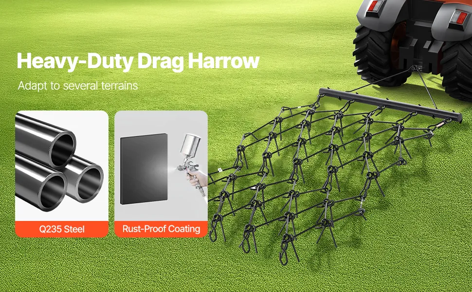 Heavy-Duty Durability: Our drag harrow is made from thickened Q235 steel, resistant to bending and deformation. The rust-resistant coating ensures it remains durable even in harsh environments, making it the perfect partner for tackling any tough terrain and ensuring seamless farming.