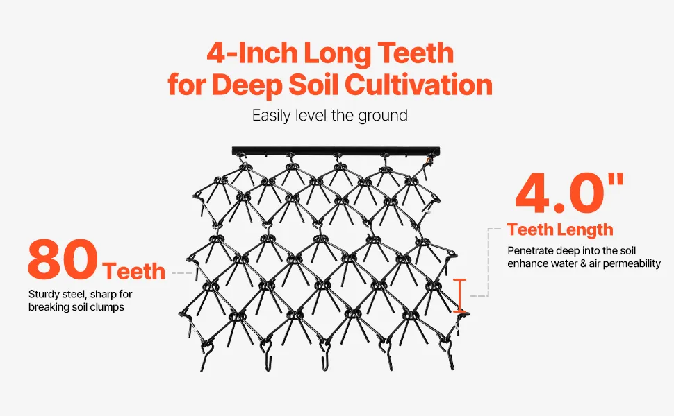 With 80 sturdy teeth, each 5.9 in long, this chain harrow rake penetrates the soil easily, breaking up hard ground and enhancing soil aeration and drainage for improved soil health.