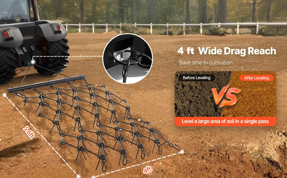 Wide Land Coverage: With the dimension (5.6 x 4 ft /1707 x 1219 mm), it handles a larger area with each pass, reducing work complexity and saving time. The simple hitch ring design allows for easy connection, and with a 2" trailer ball, this drag harrow rake ensures smooth operation and greater maneuverability.