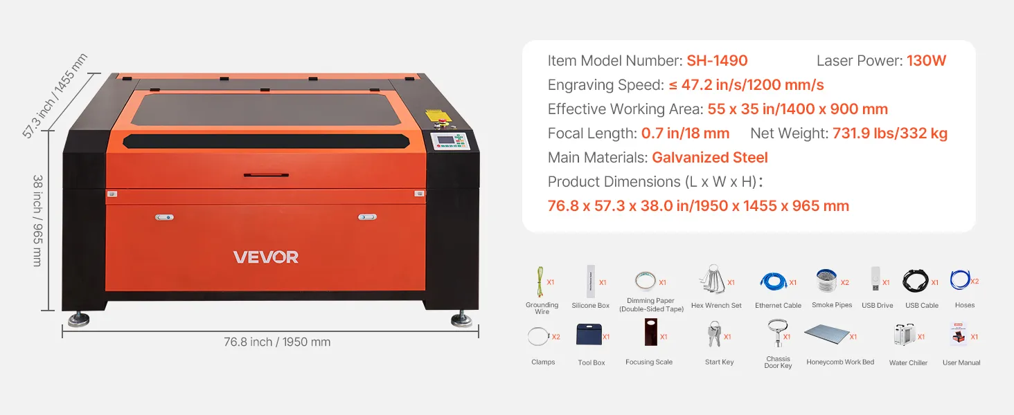 VEVOR 130W CO2 Laser Engraver, 1400 x 900 mm, CO2 Laser Engraver Cutter Machine with Water Chiller, 2 Way Pass Air Assist, 1200 mm/s Speed, Autofocus Engraving Cutting Machine, for Wood Acrylic Glass