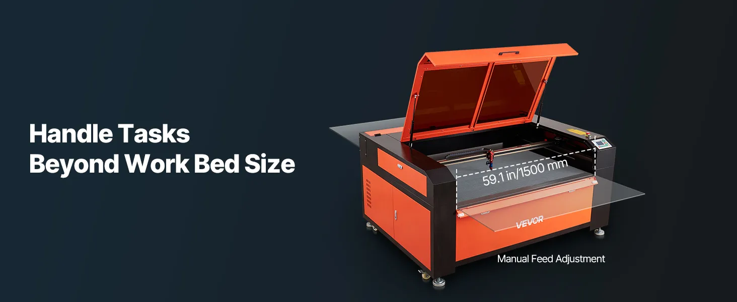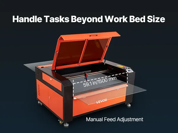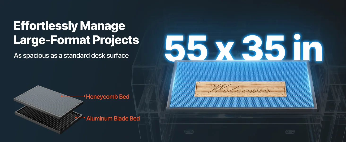 Spacious Dual Work Beds: The 55 x 35 in work area accommodates signs and furniture panels. A two-way pass-through design allows for longer materials and easy manual feeding. This CO2 laser engraver cutter includes a honeycomb bed and an aluminum blade bed