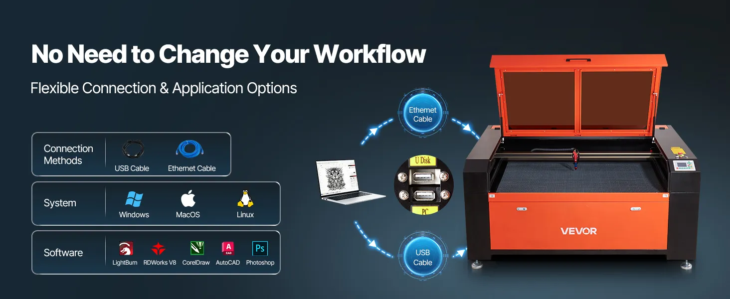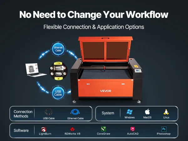 Broad Compatibility: Connect via USB or power cable and work seamlessly across Windows, macOS, and Linux systems. This CO2 laser engraver cutter is fully compatible with LightBurn, RDWorks, and other popular design software