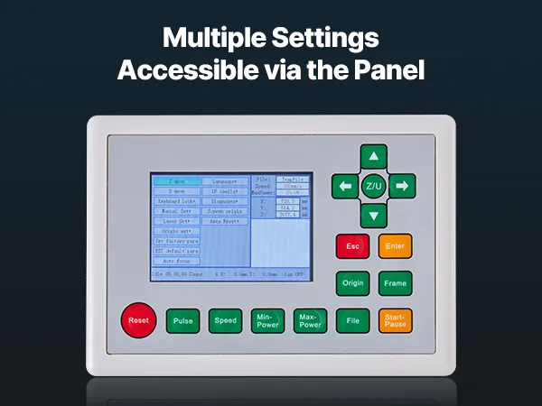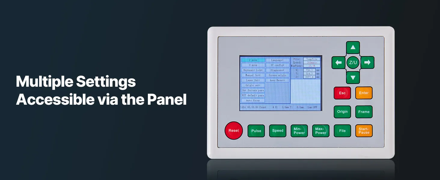 Precise Auto Focus: Our CO2 laser cutter is equipped with an autofocus function. The motor-controlled system auto adjusts the laser head height to match your material. Just input the material thickness or use the control panel for precise focus every time