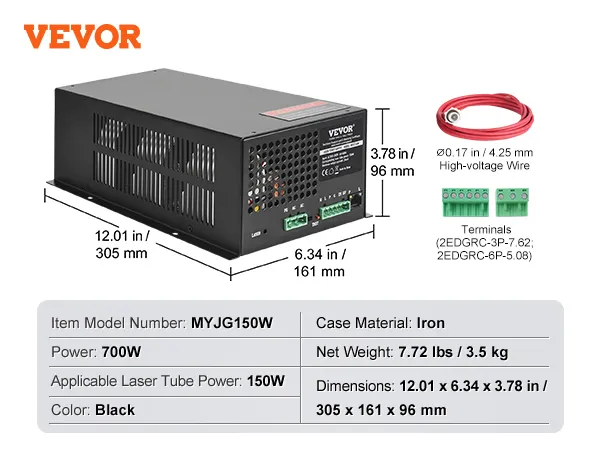 VEVOR CO2 Laser Power Supply, 150W, Power Supply for 150W Laser Tube, Constant Current Protection, Open Circuit Protection, Fast Heat Dissipation, Compatible for Multi-brand Laser Engravers & Cutters