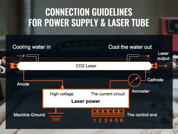 The laser tube must be cooled with water when working, and at the same time, do not turn on the high-voltage output, and ensure that the positive and negative terminals of the high-voltage output must be correctly connected with the positive and negative terminals of the laser.