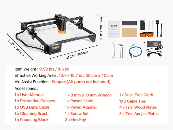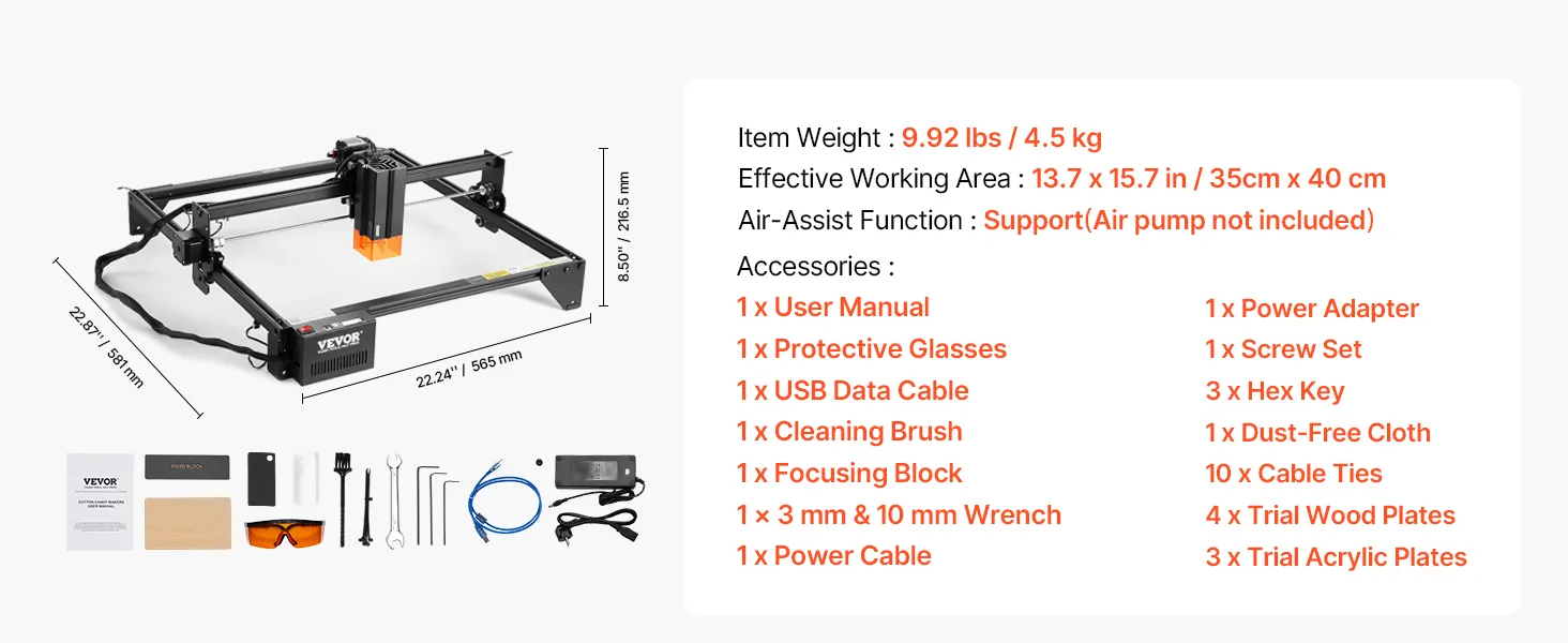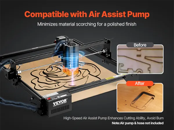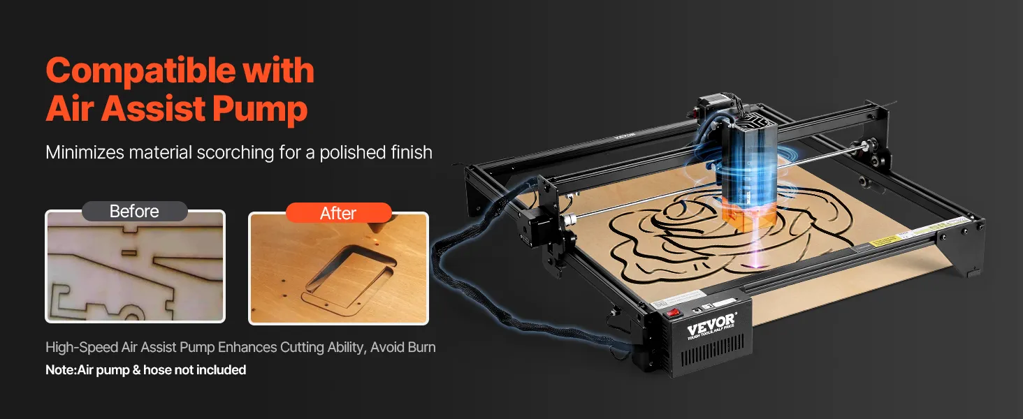 Compatible with Air Assist Pump: Enhance cutting performance with air assist compatibility. When paired with an air assist pump, high-speed airflow improves cutting efficiency, avoids dark edges, and delivers a clean, smooth finish. This laser engraver also helps lower surface temperatures during engraving and cutting, resulting in crisp, precise edges (Air assist pump not included)