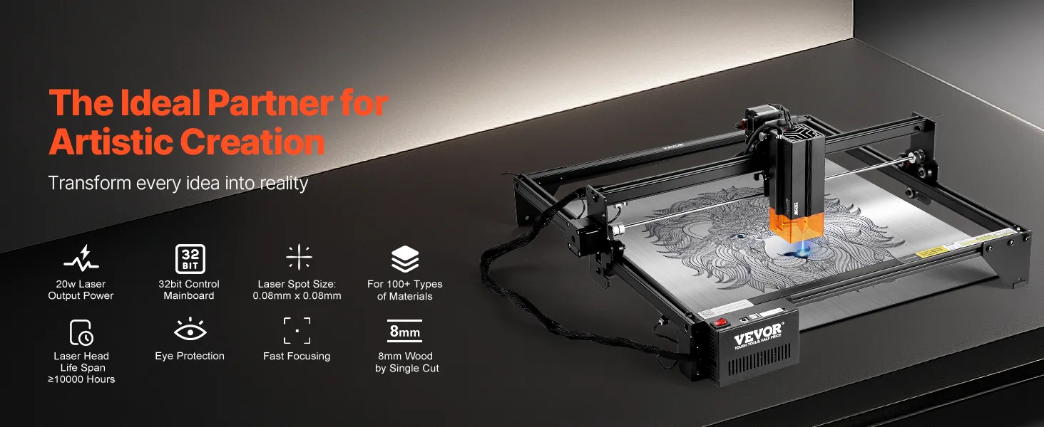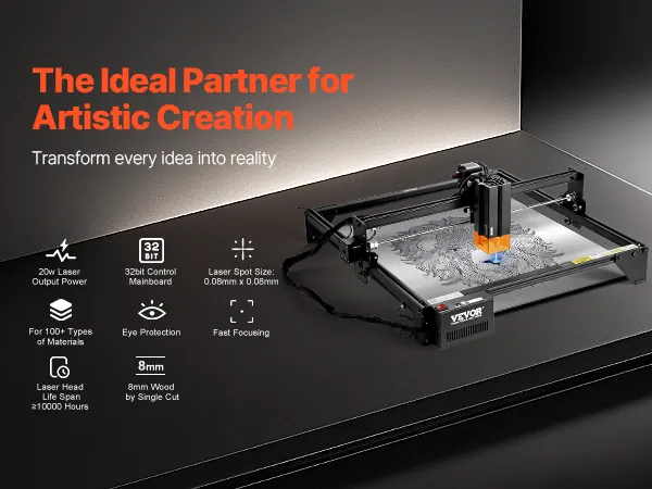 If you're looking for a user-friendly, high-precision laser engraver, this 20W model has everything you need. With a 13.7 x 15.7 in (350 x 400 mm) large working area, 0.08 x 0.08 mm laser spot, 10,000 mm/min movement speed, it is ideal for DIY hobbyists, crafters, designers, artists, etc.