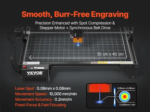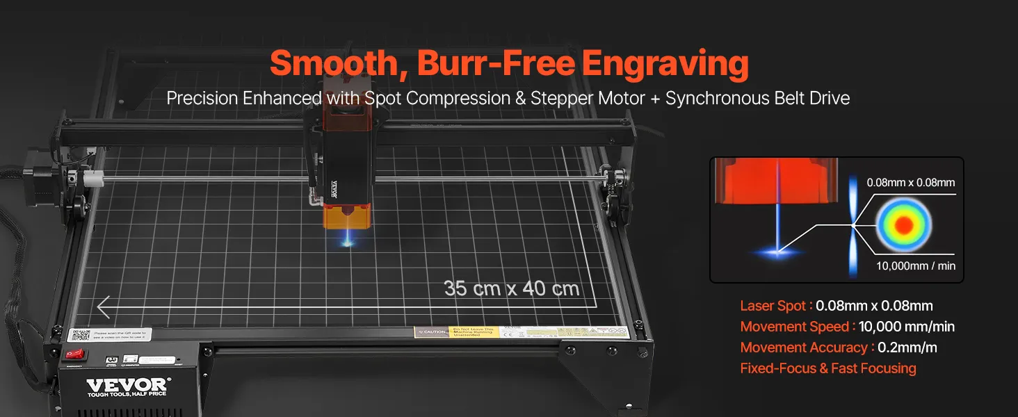 Precision and Craftsmanship Combined: Our laser engraving machine features innovative laser technology and spot compression, delivering faster and more accurate results for all your engraving needs. The 0.08 x 0.08 mm laser beam size ensures concentrated energy and finer, easier engraving and cutting. With a stepper motor and synchronous belt drive, it achieves high-speed engraving up to 10,000 mm/min