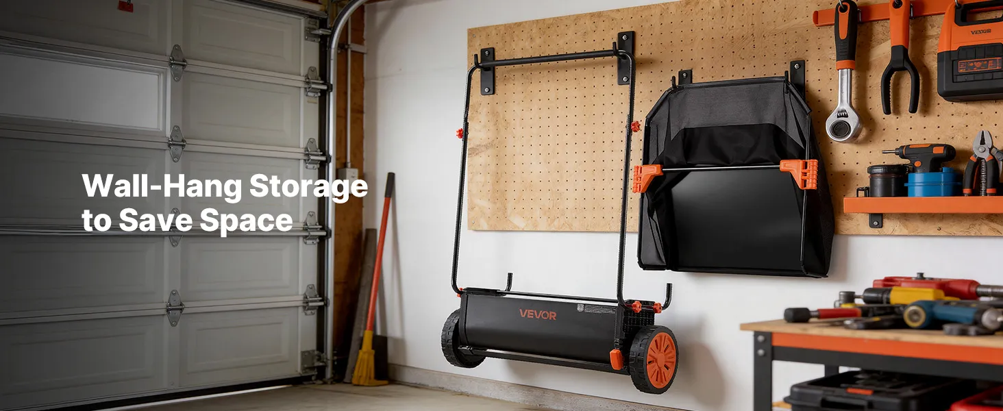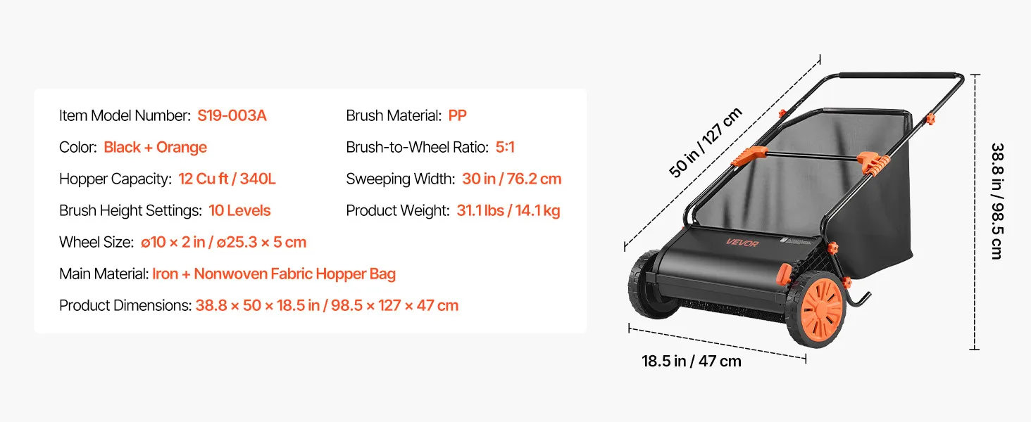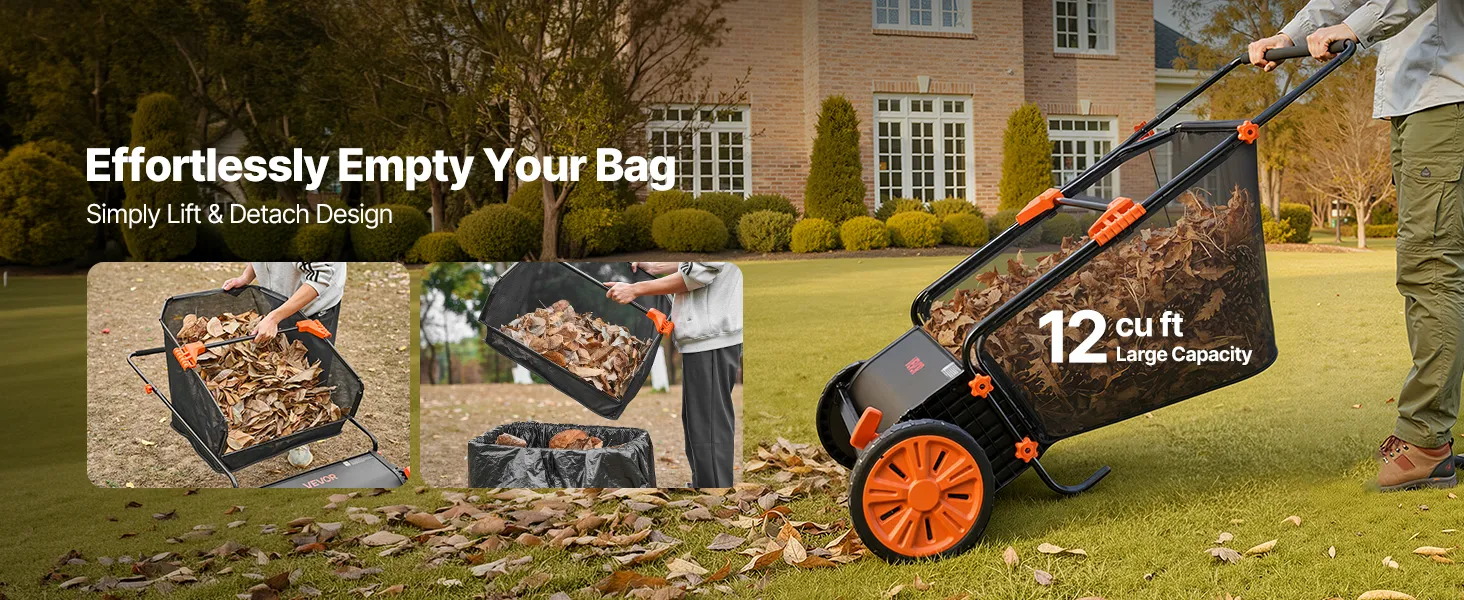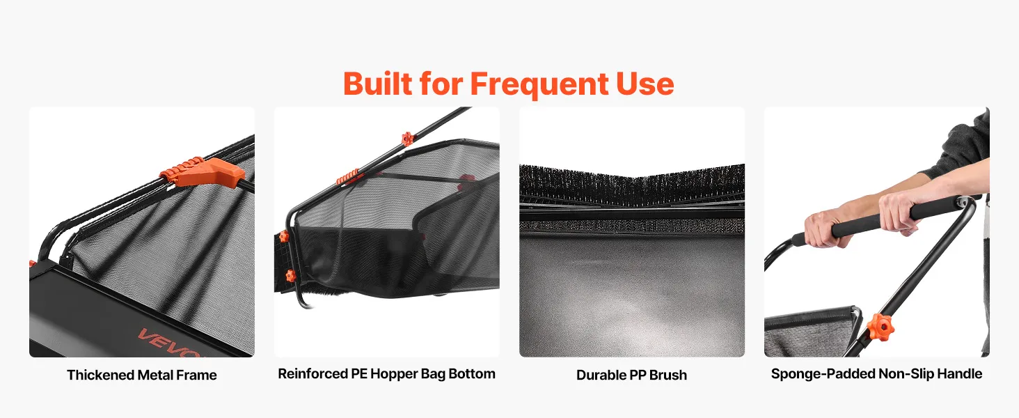 Large-Capacity Hopper Bag: This garden sweeper includes a tear-resistant 12 cu.ft. hopper bag, reducing emptying frequency. Four-point quick-release buckles make dumping easy, while the foam-padded handle minimizes fatigue. Core parts have been assembled. Simply attach frame and hopper for instant use
