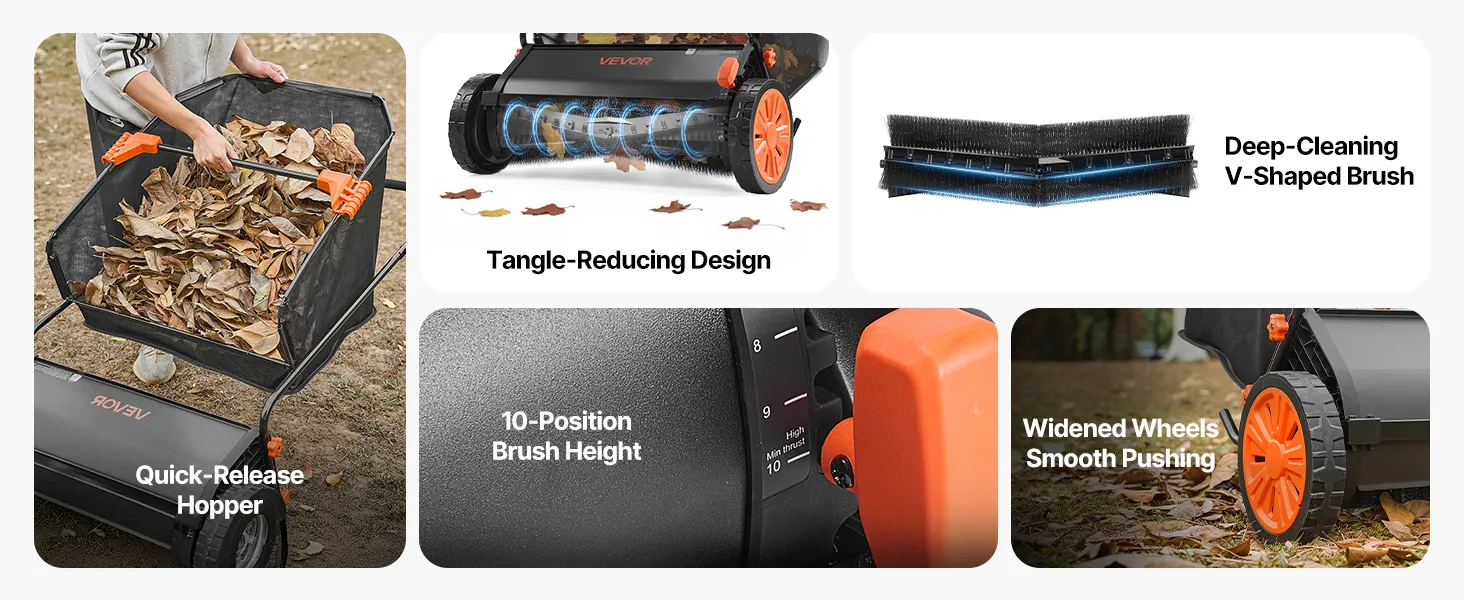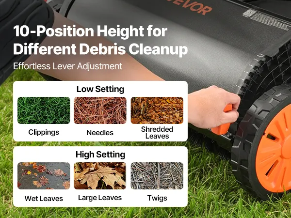 10-Level Brush Height: The leaf and grass collector features 10-setting adjustable brush height for short/tall grass, uneven ground, and concrete surface. Side-mounted adjustment handle allows quick, precise control for flexible cleaning depth