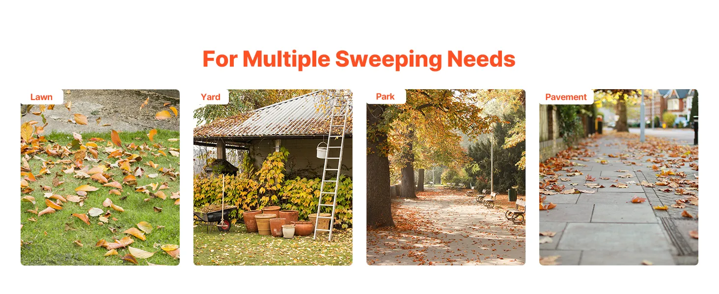 Equipped with two upgraded PP and rubber wheels for improved durability and stability. The yard sweeper rolls smoothly over short grass, tall grass, and uneven or bumpy terrain with less effort.