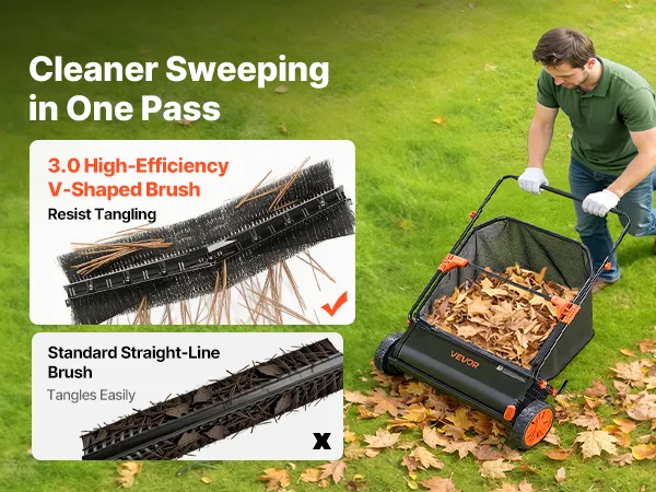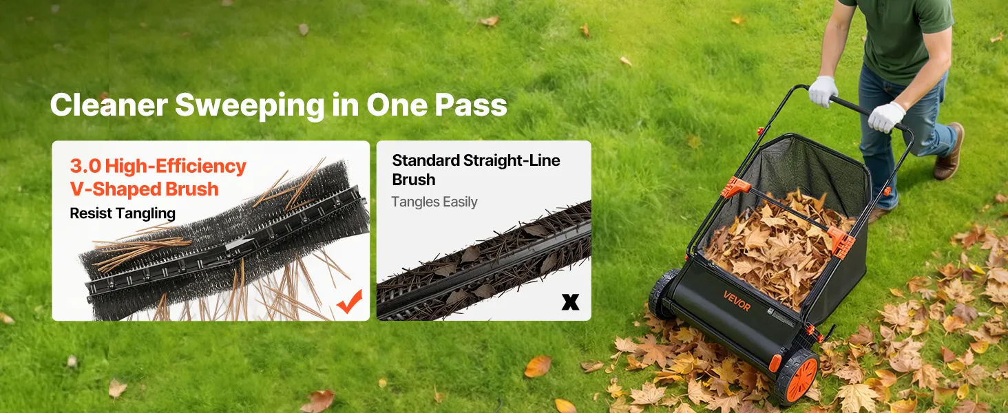 High-Efficient V-Shaped Brush: This push lawn sweeper comes with three V-shaped rotating brushes that reach deep into grass while reducing ground resistance. Durable PP bristles resist tangling from weeds and pine needles, saving time on brush maintenance
