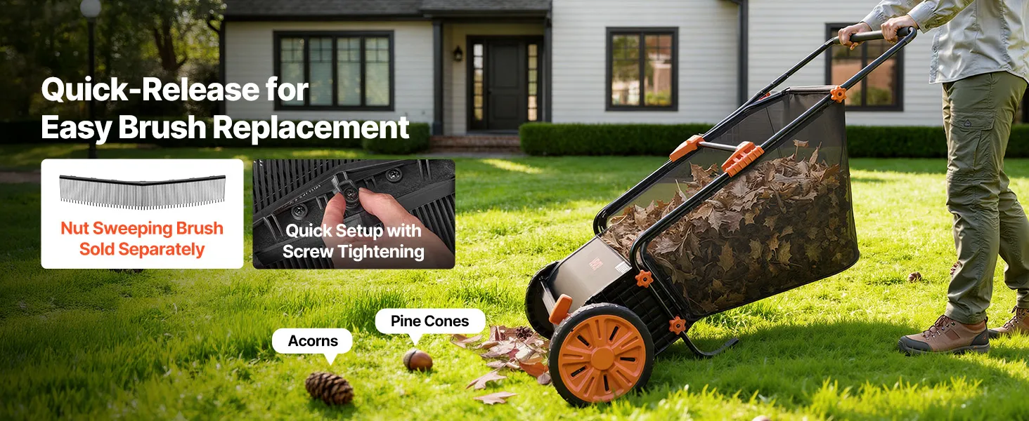 Effortless Lawn Cleanup: This lawn sweeper features a durable metal frame, 30 in sweep path, and a 1:5 brush-to-wheel ratio to collect grass clippings, leaves, pine needles in fewer passes on lawns, patios, driveways. Note: Wet leaves may reduce sweeping efficiency. Optional replacement brushes are available for hard nuts