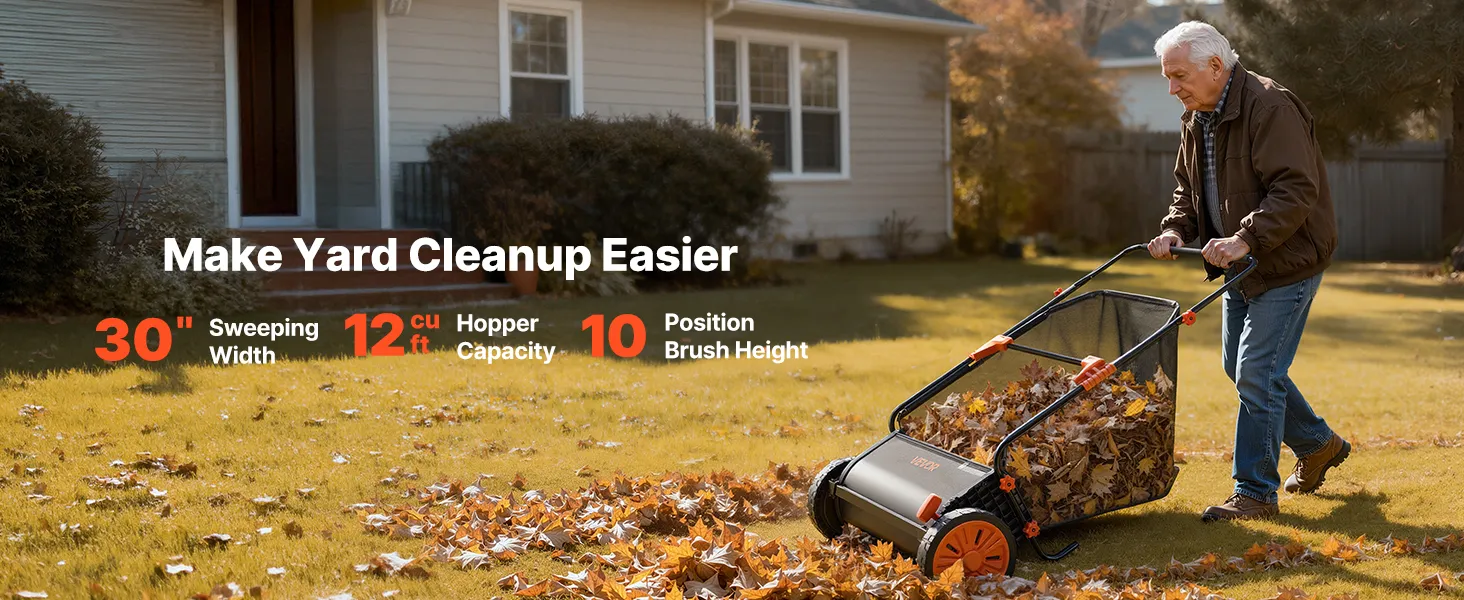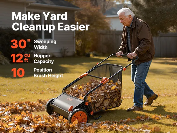 This 30 in (76.2 cm) push lawn sweeper features an upgraded V-shaped brush design with 10 adjustable height levels, allowing you to control sweeping depth and thoroughly collect grass clippings, pine needles, and fallen leaves.
