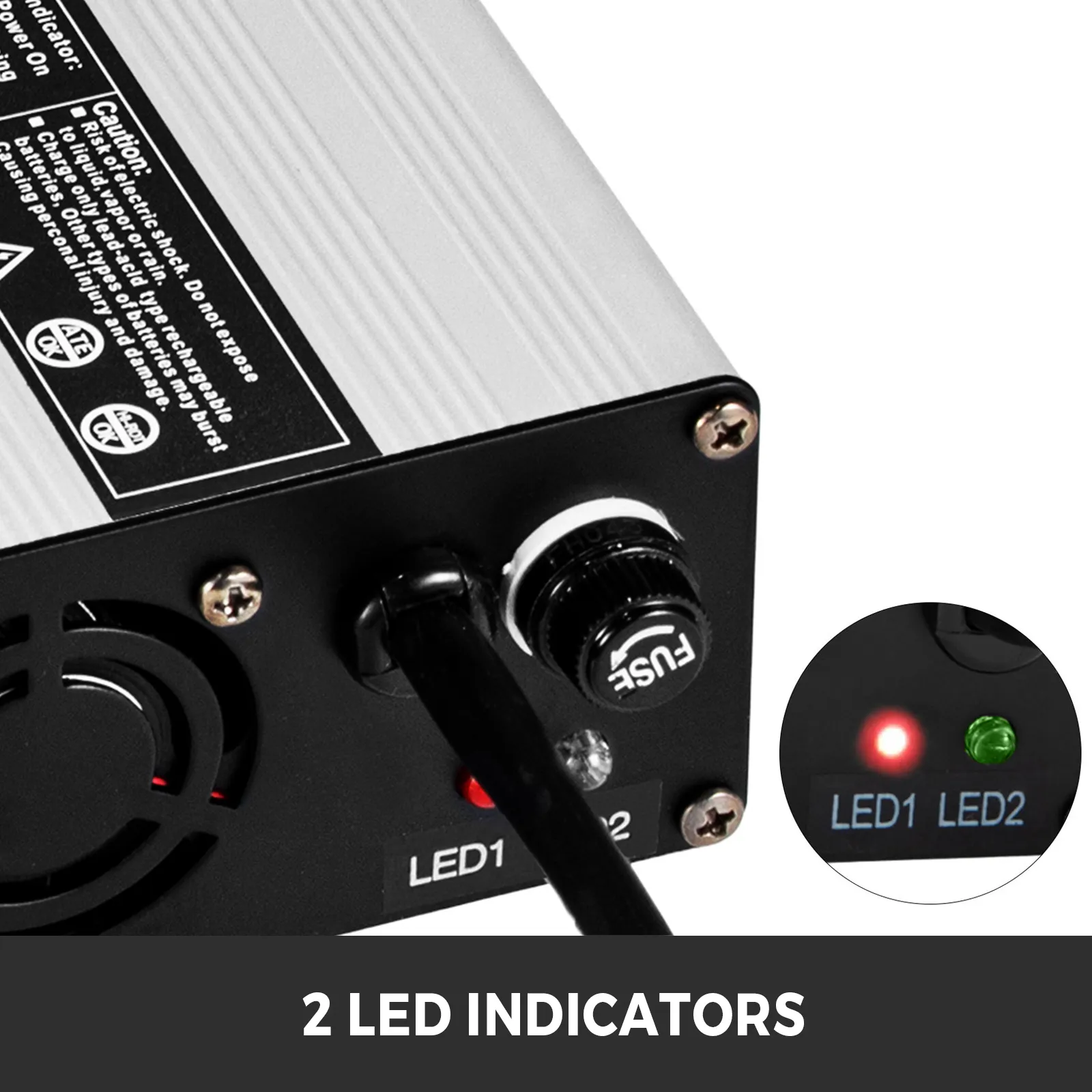 It comes with 2 LED indicator lights; LED1 Red (power on), LED2 Red/green( charging/full).