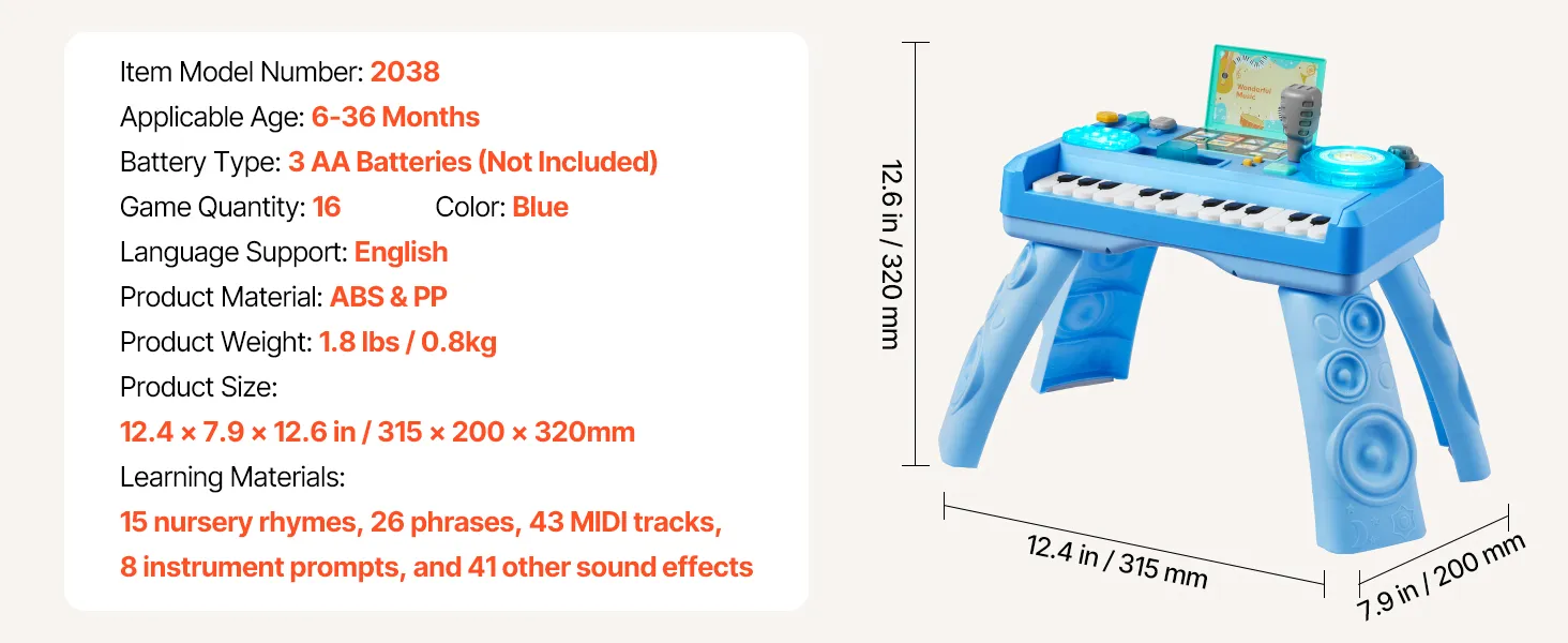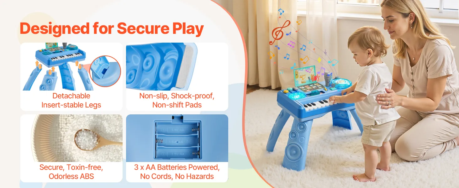 Stable, Thoughtful Build: This baby DJ set uses reinforced plug-in legs and anti-slip pads for steady play. The durable ABS body feels parent-approved. The setup runs on 3 AA batteries (not included) to keep spaces cord-free