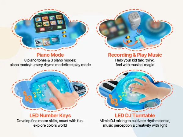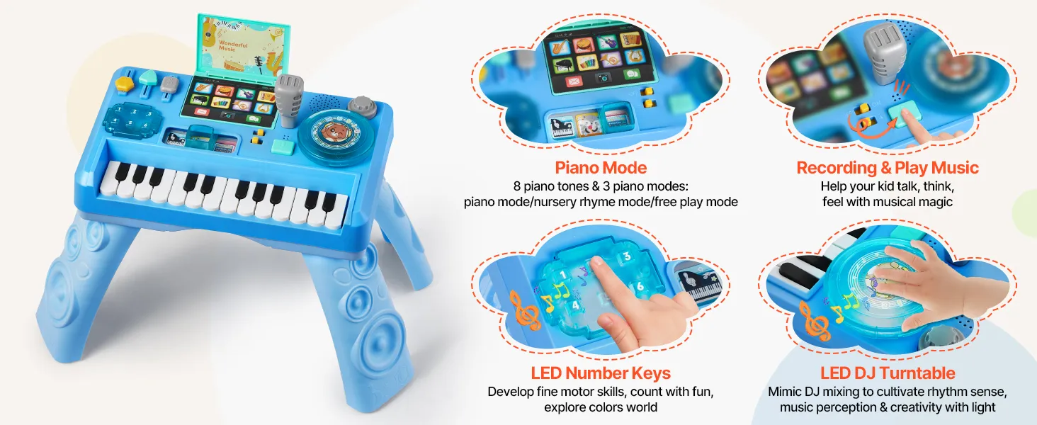 All-in-One Activity Hub: This toddler DJ table packs 15 tunes, 26 phrases, and 43 MIDI effects, plus three piano modes with eight tones, record & playback, number lights, and an LED DJ turntable—so much to explore! Ready to jam and imagine