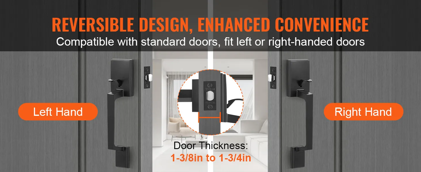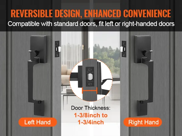 Reversible Handle Design: The high-quality front entry door handle is suitable for both left and right-handed doors. It is compatible with standard doors within a thickness range of 1-3/8 to 1-3/4 inches