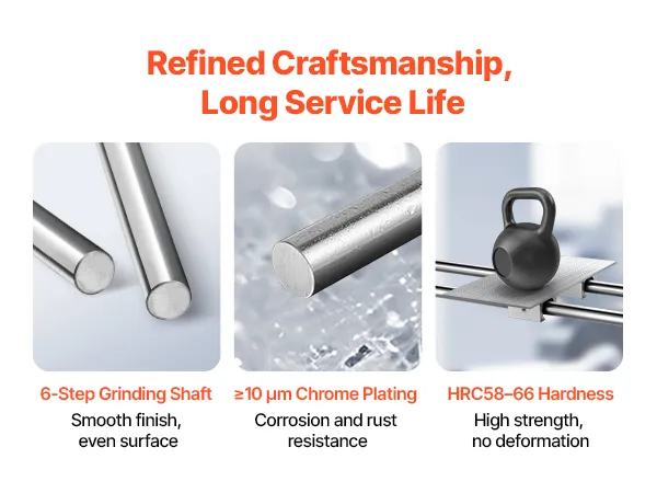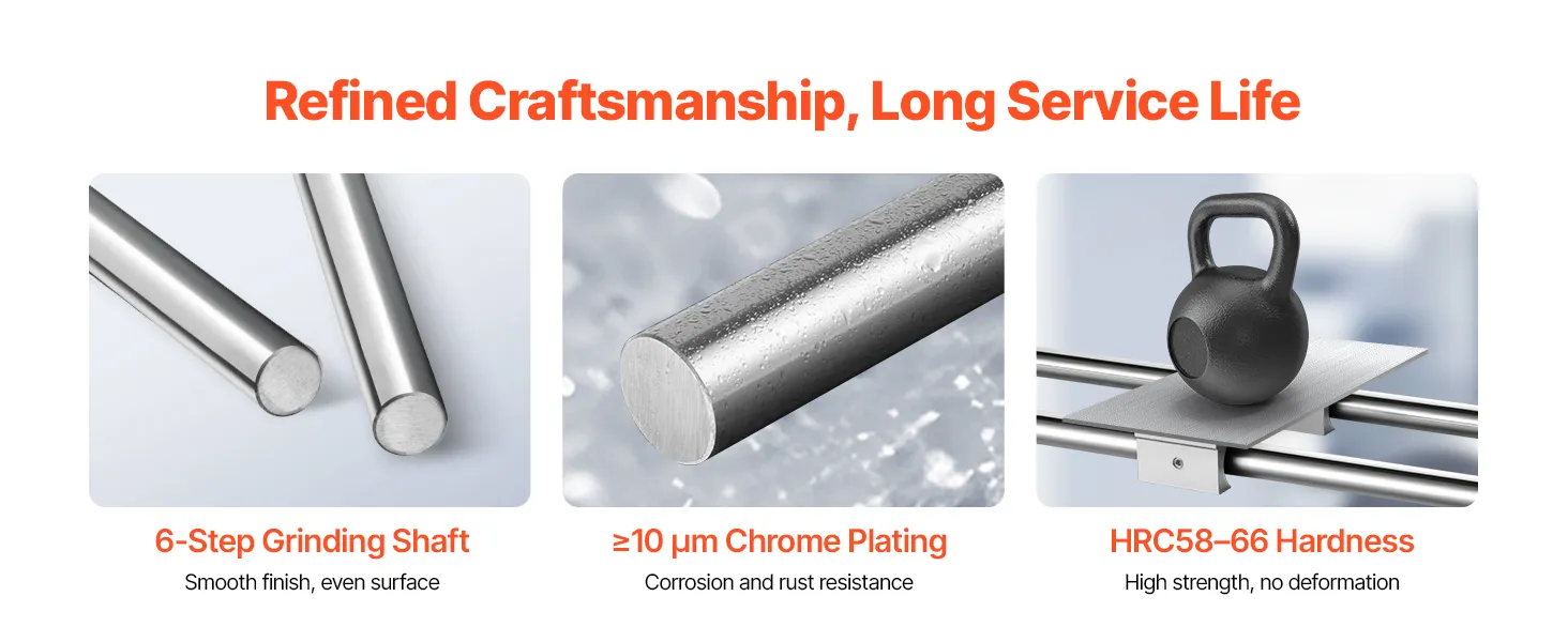 Hardened Carbon Steel Shaft: Crafted from carbon steel with a hardness of HRC58–66, the linear guide rail shaft delivers exceptional strength and resists bending under heavy-duty use, maintaining consistent accuracy in automation and mechanical systems