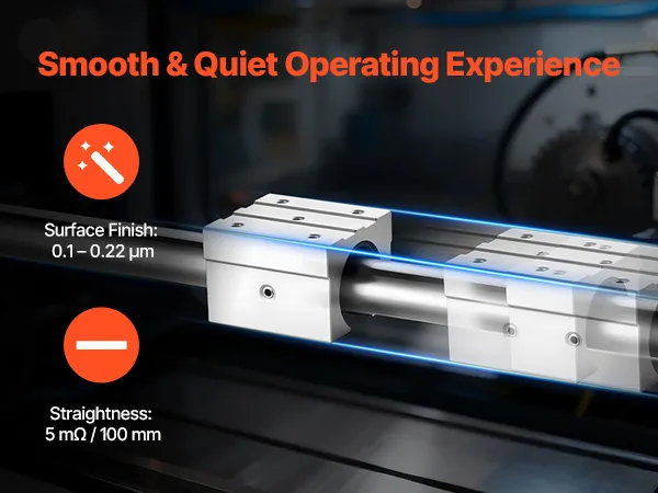 High-Precision Linear Motion: Manufactured using a six-step grinding process, the guide rail shaft achieves a 0.1–0.22 μm surface finish and a 5 mΩ straightness, delivering reliable, repeatable travel over time