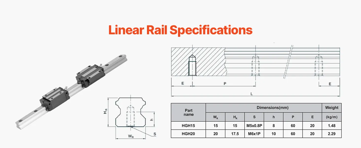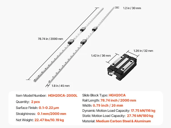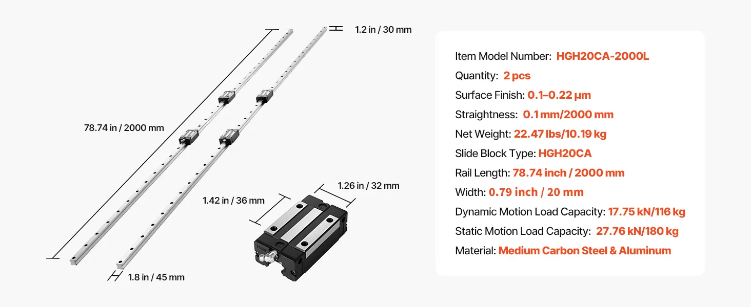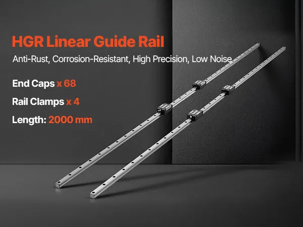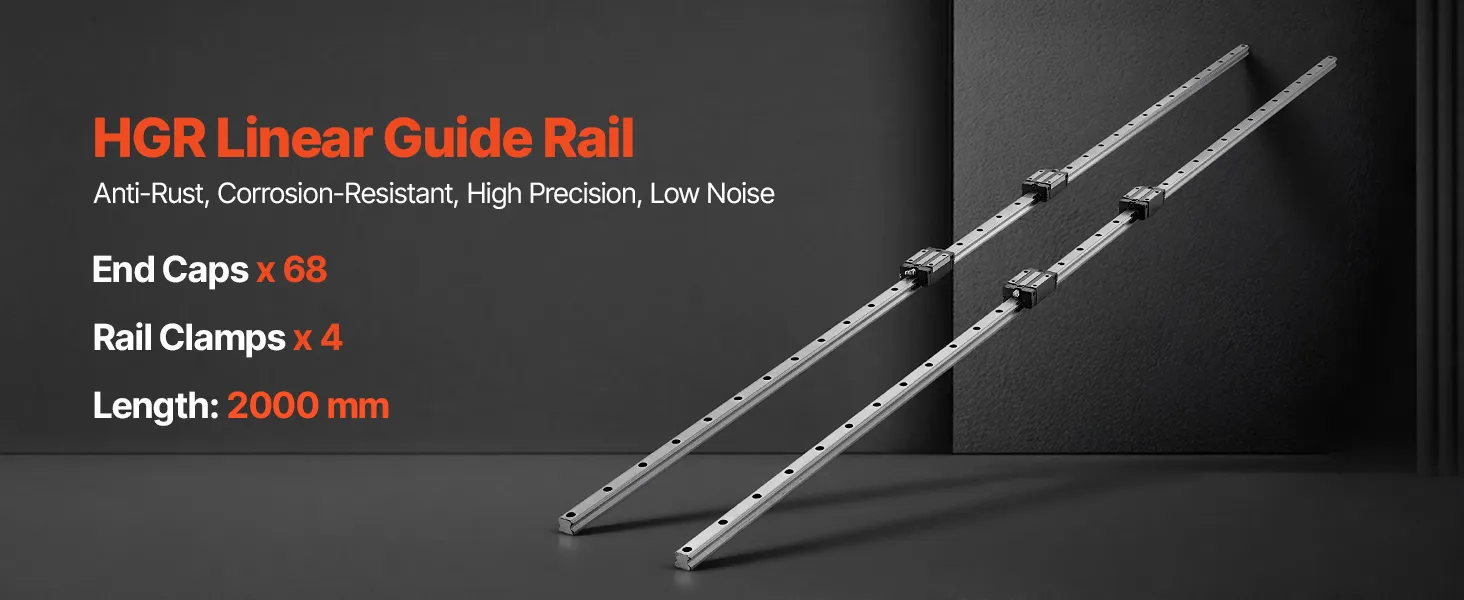 HGR Linear Rail Kit: Comes with 2 x 78.74 in (2000 mm) linear rails, 68 x end caps, and 4 x rail clamps. This set is compatible with milling machines, 3D printers, industrial machines, and cutting machines