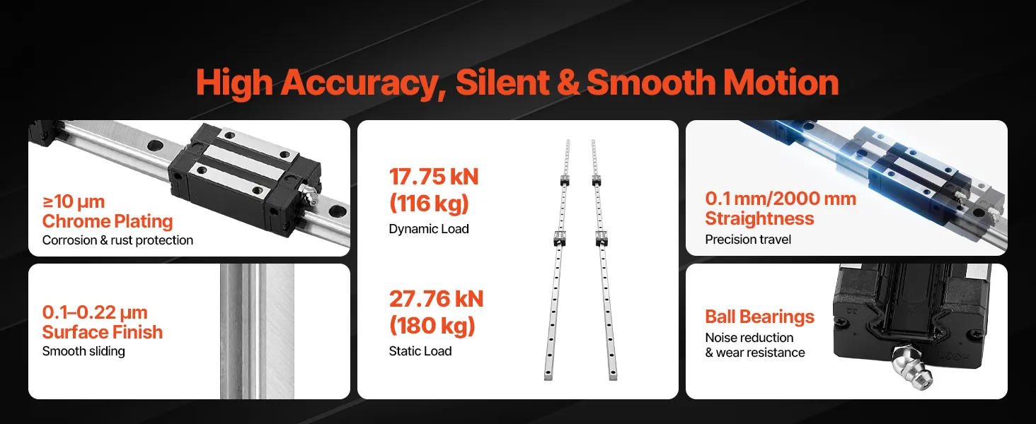 Includes 2 linear rails, 4 slide blocks, 68 end caps, and 4 rail clamps. Designed with precise mounting holes and hole spacing, our medium-carbon steel rails ensure reduced vibration and quiet linear motion. Every alloy steel slide block is built with ball bearings for jam-free travel.