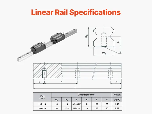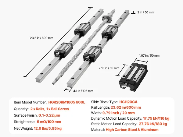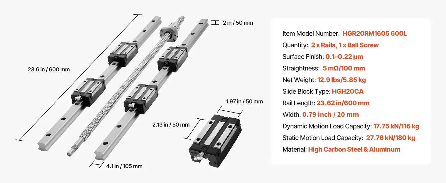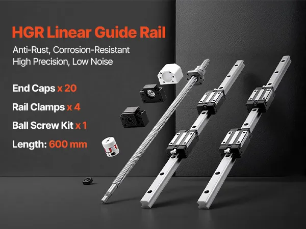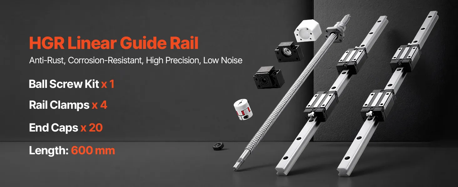 HGR Linear Rail Kit: Comes with two 23.62 in (600 mm) linear rails and a ball screw. This set is compatible with milling machines, 3D printers, industrial machines, and cutting machines