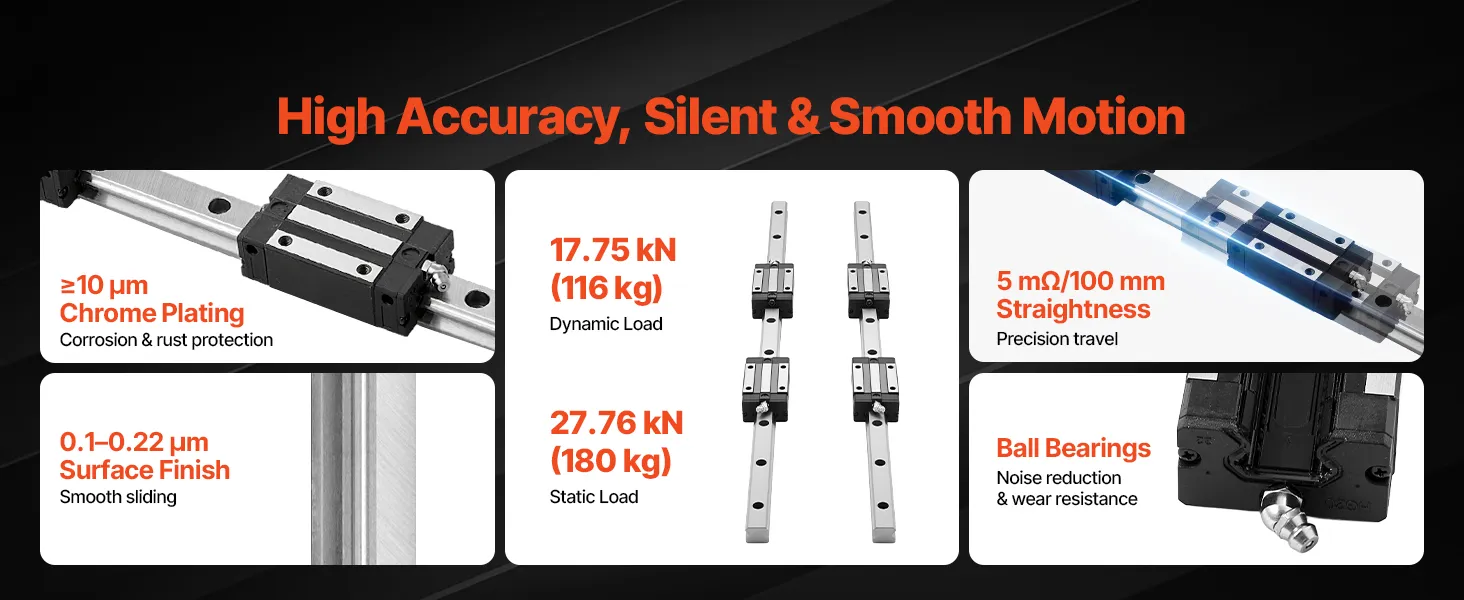 Rust & Corrosion Protection: Crafted from high-hardness medium-carbon steel (HRC58–62) linear rail and alloy steel slide blocks with pre-drilled holes. Electroplated coating is at least 10 μm to resist rust and corrosion even in humid basements