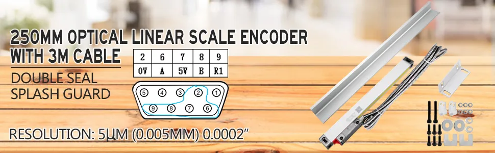 Here we offer you 250mm Linear Scale with accuracy 0.0002" for metal working — lathes, cylindrical grinders, milling machines, surface grinders, boring mills and other machine tools to allow the operator to work faster with resolution: 5μm.